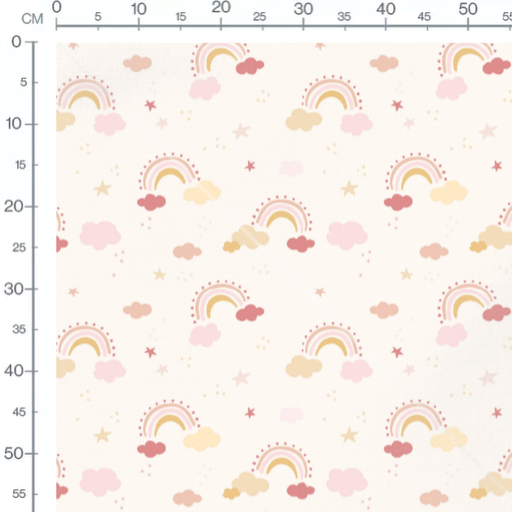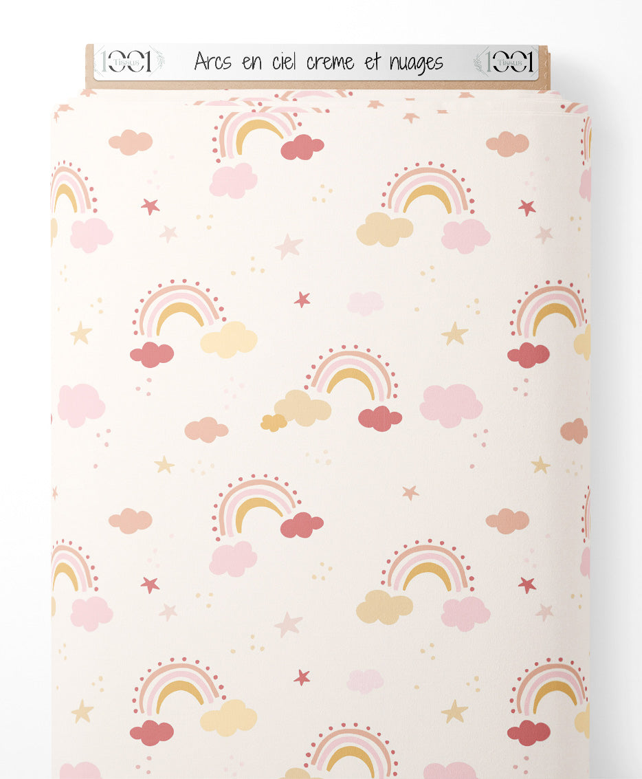 Les arcs-en-ciel sont entourés de petits points roses. Les nuages varient entre le rose clair et le beige. Des étoiles de différentes tailles ajoutent une touche de fantaisie.Les tissus