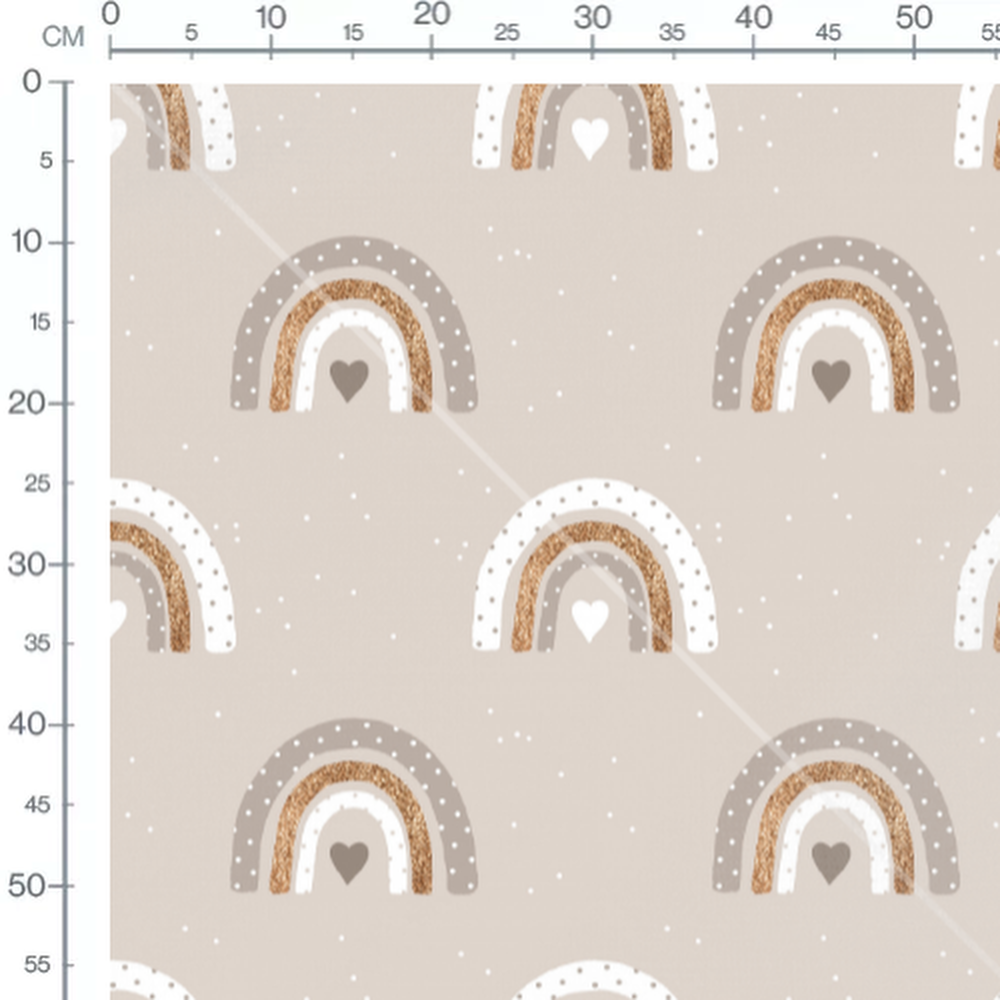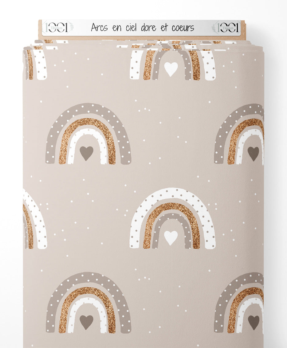 Les arcs-en-ciel sont composés de nuances de beige et de doré. Des cœurs et des pois blancs ajoutent des détails subtils au motif.Les tissus