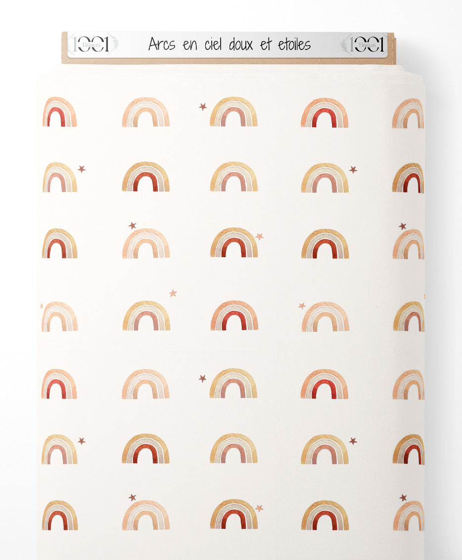 Les arcs-en-ciel sont accompagnés de petites étoiles dispersées. Les nuances de rose, beige et ocre créent une ambiance douce et apaisante.Les tissus