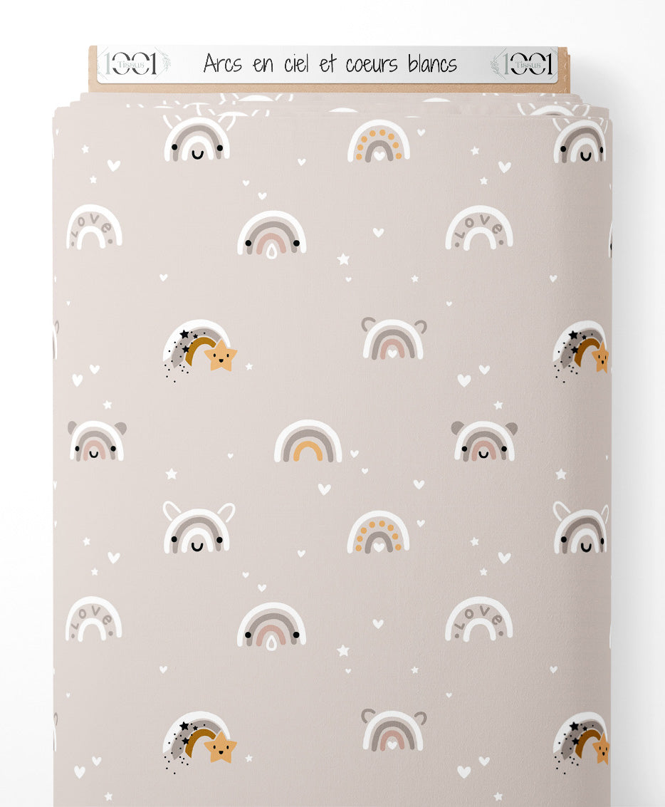 Les arcs-en-ciel sont accompagnés de petites étoiles et de cœurs. Des visages d'ours souriants sont intégrés dans le motif. Le fond beige est parsemé de petits éléments décoratifs blancs.Les tissus