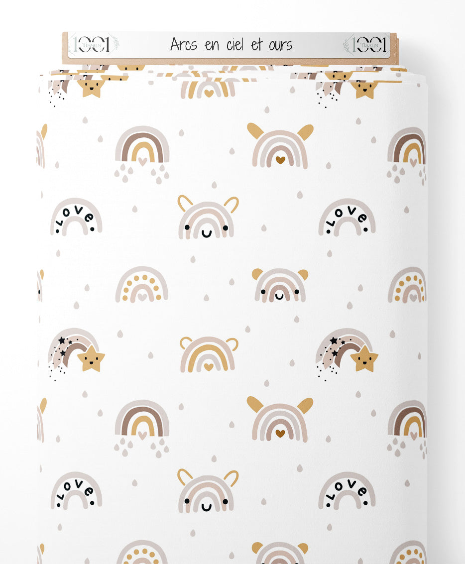 Les arcs-en-ciel sont accompagnés de gouttes grises et de petits visages d'ours souriants. Des étoiles noires ajoutent un détail subtil au motif. Le mot 'love' est inscrit sur l'un des arcs-en-ciel.Les tissus