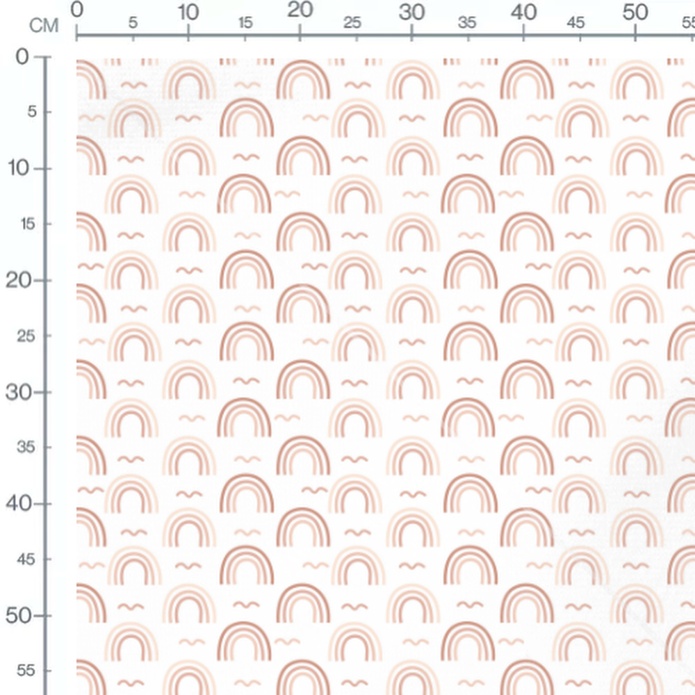 Les arcs-en-ciel sont composés de plusieurs nuances de rose et de beige. Les vagues ondulées ajoutent un élément de mouvement subtil au motif.Les tissus