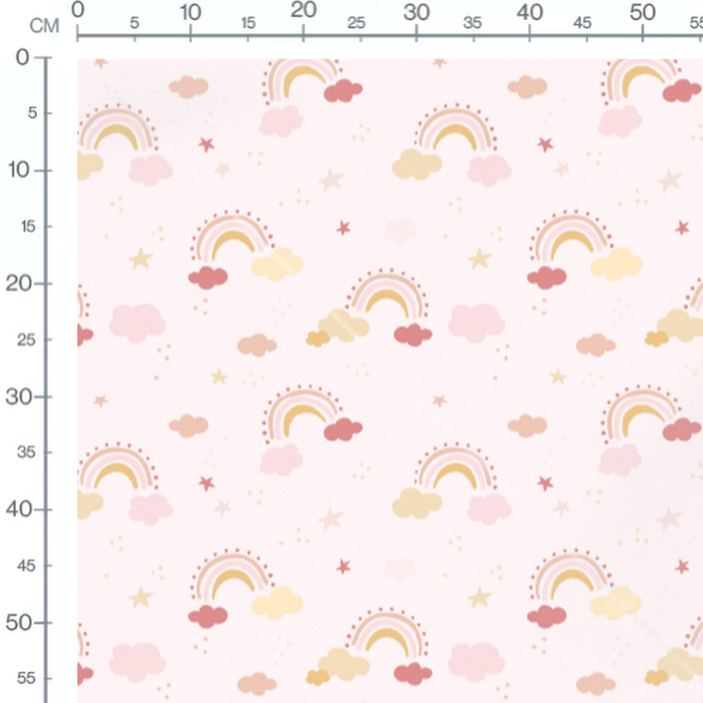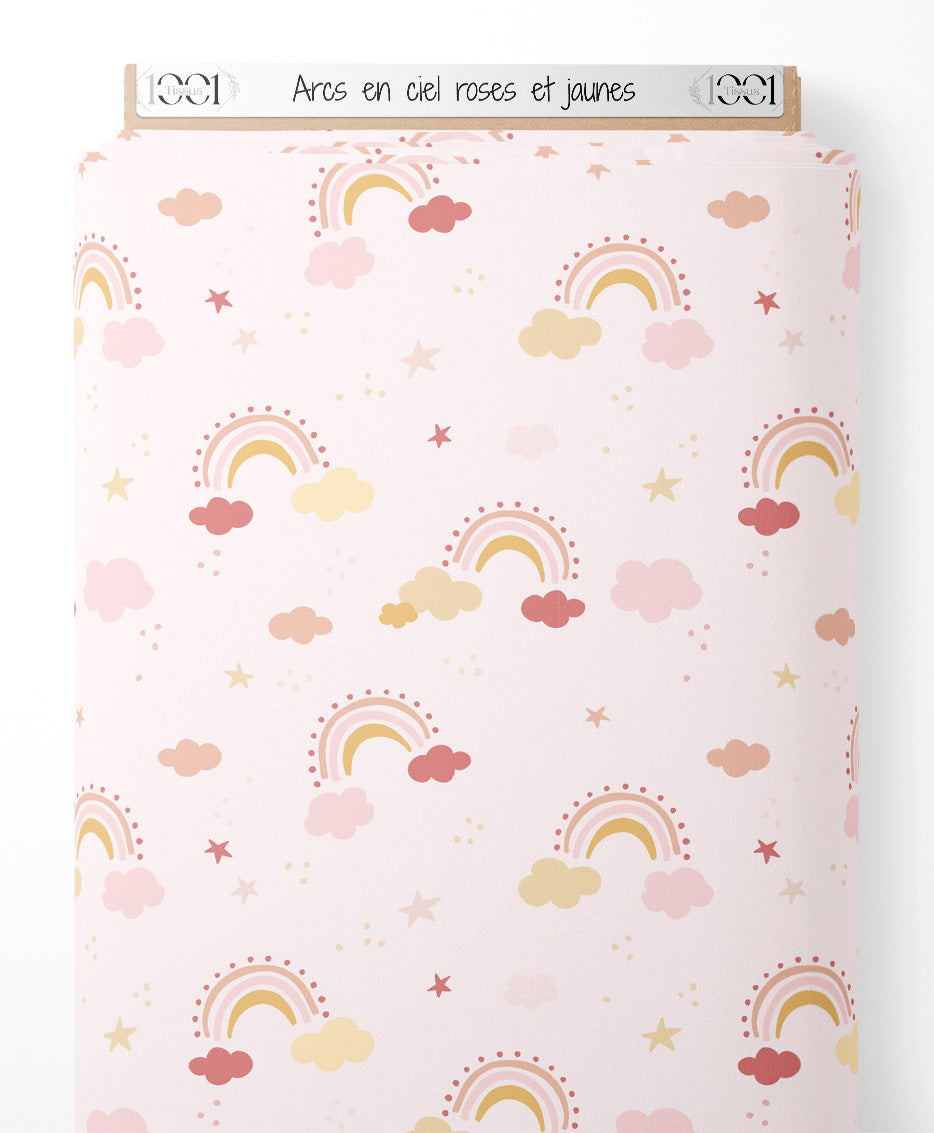 Les arcs-en-ciel sont entourés de petits points roses. Les nuages varient en teintes de rose et de jaune. De petites étoiles rouges et jaunes ajoutent des détails subtils.Les tissus