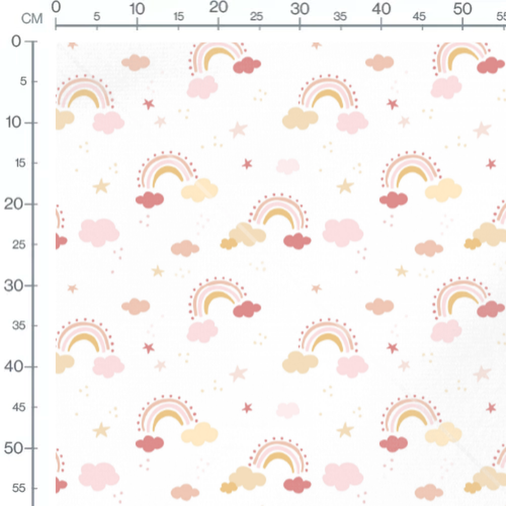 Les arcs-en-ciel sont entourés de petits points roses. Les nuages varient entre le rose et le jaune pâle. De petites étoiles et points complètent le motif.Les tissus