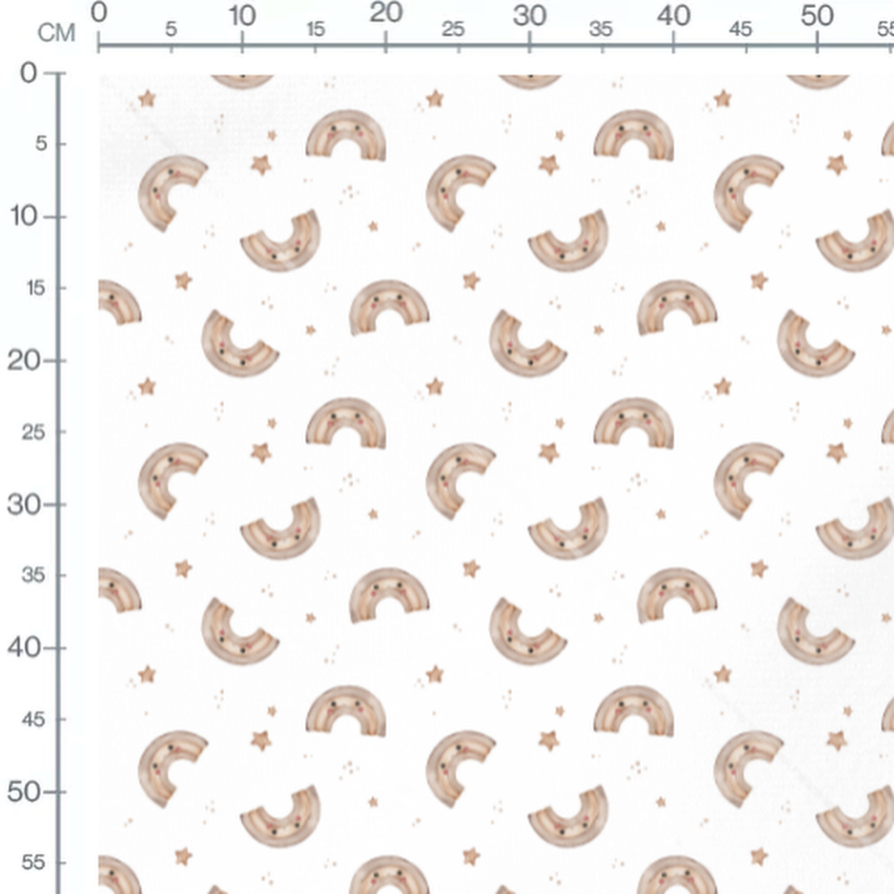 Les arcs-en-ciel ont des visages souriants avec des joues roses. Les étoiles sont de couleur beige et ajoutent une touche ludique au motif.Les tissus