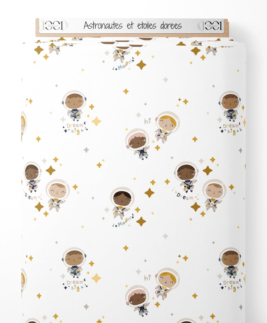 Les astronautes portent des combinaisons spatiales blanches et grises. Des mots comme 'Dream Big' et 'Moon' sont intégrés au motif. Les étoiles varient en taille et en couleur, ajoutant une touche ludique.Les tissus