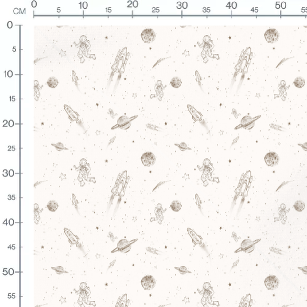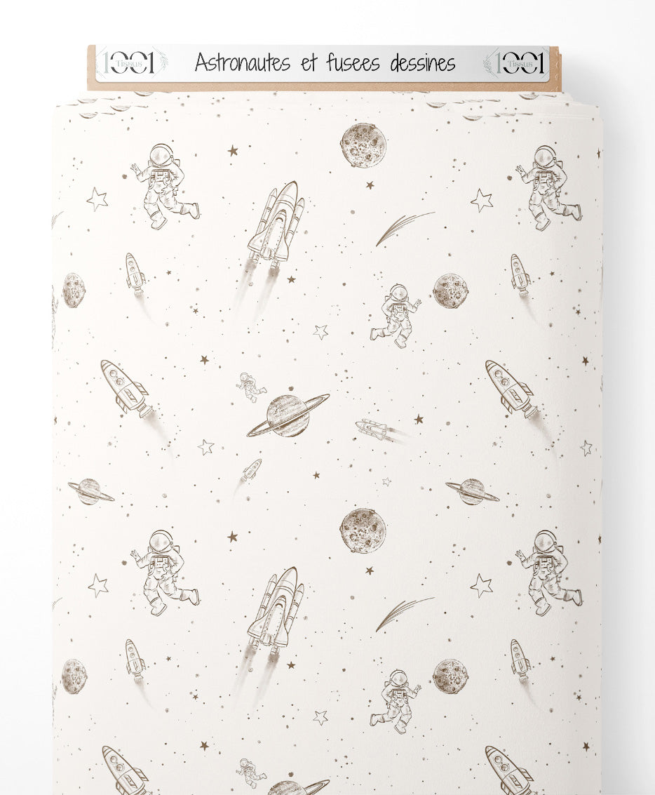 Les astronautes flottent parmi les étoiles et les planètes. Des fusées semblent s'élancer dans l'espace. Les planètes sont variées, avec des anneaux et des cratères visibles.Les tissus