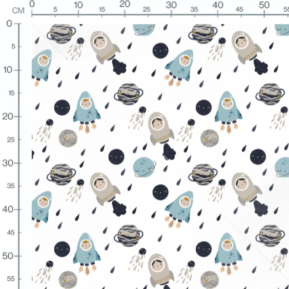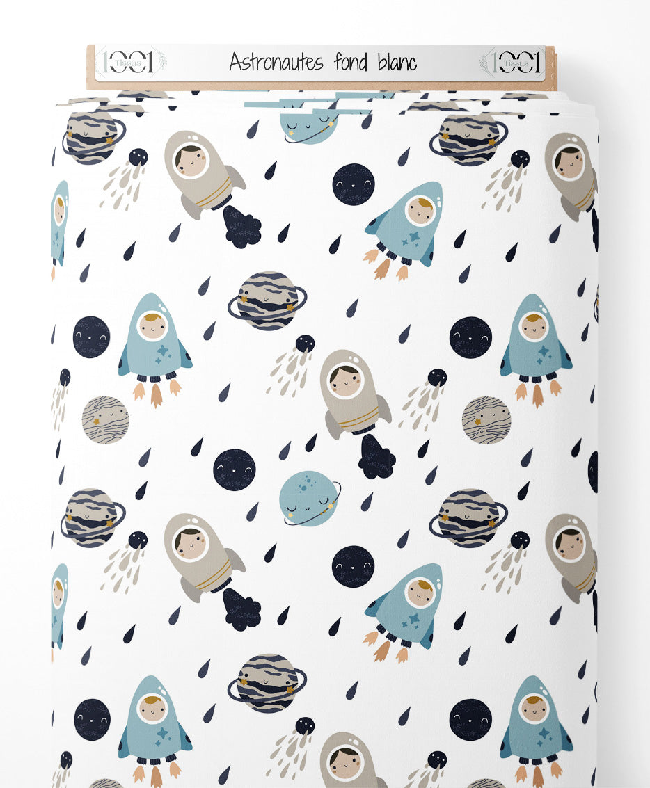 Les astronautes portent des combinaisons bleues et grises. Les planètes ont des expressions souriantes et sont entourées de petites étoiles. Les gouttes noires ajoutent un effet de pluie cosmique.Les tissus
