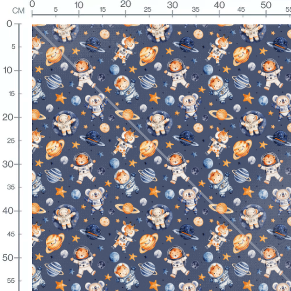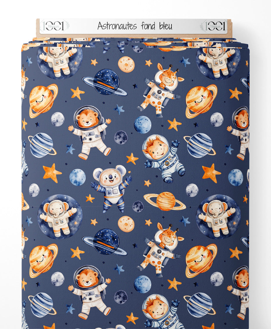 Les animaux portent des combinaisons spatiales blanches. Les planètes sont de différentes tailles et couleurs, avec des anneaux et des motifs variés.Les tissus