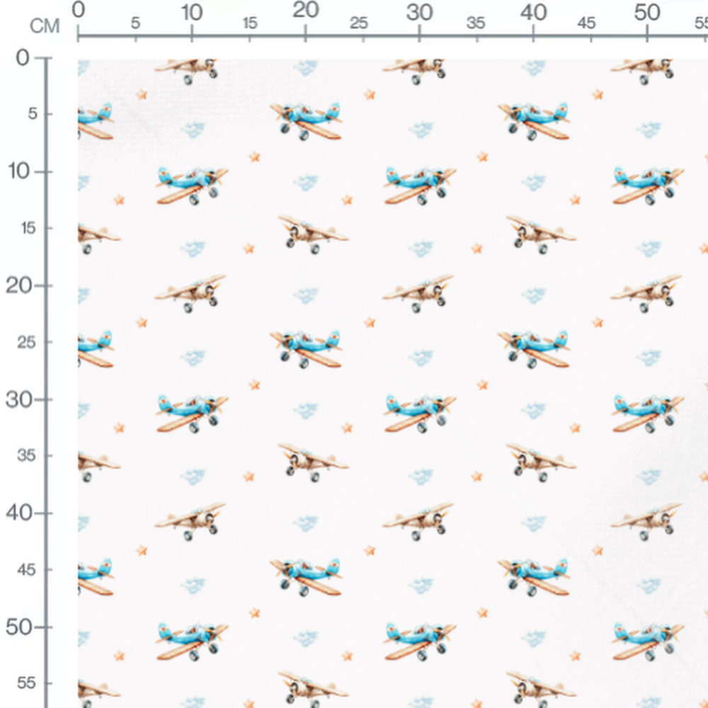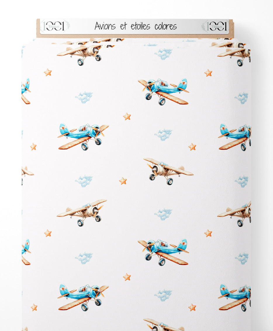 Les avions présentent des hélices et des roues détaillées. Les étoiles sont de taille uniforme et les nuages sont légèrement flous.Les tissus