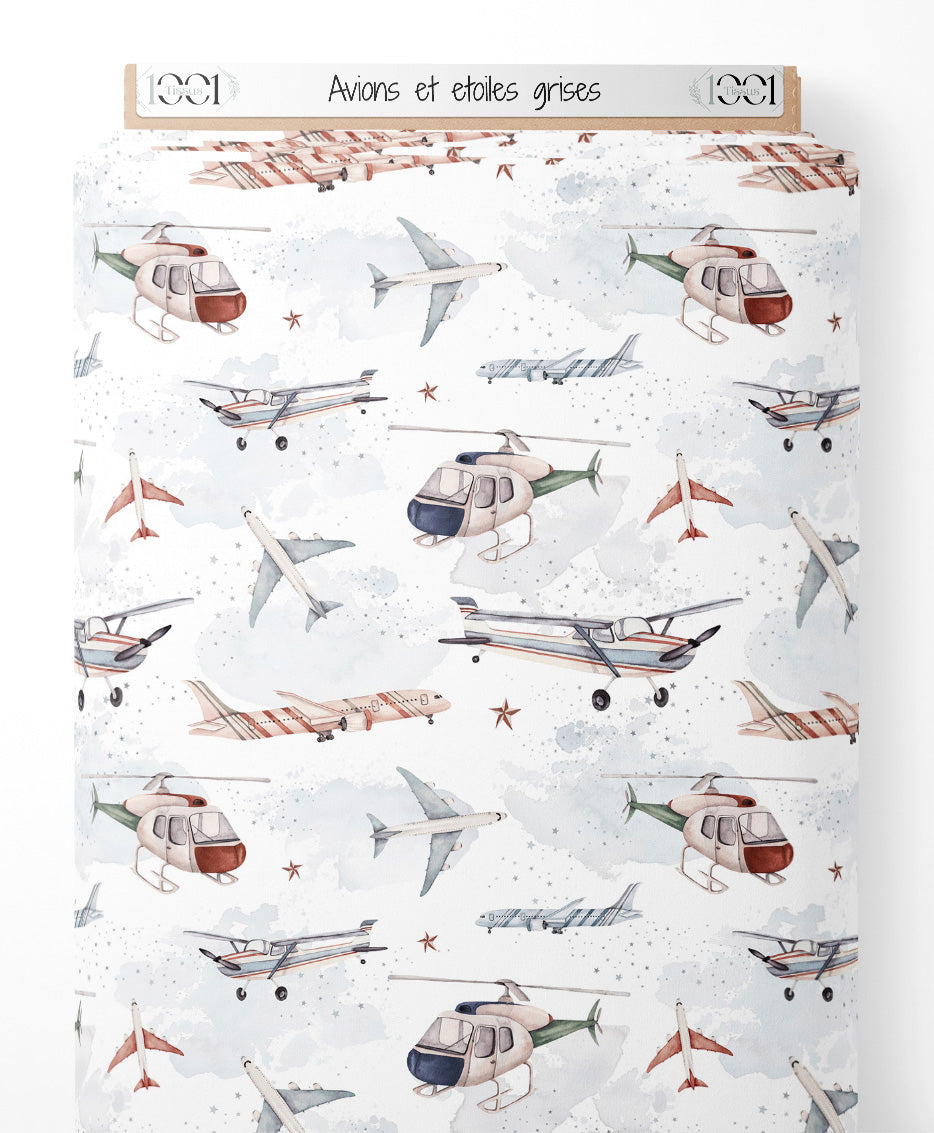 Les avions sont de différentes tailles et couleurs, incluant des nuances de bleu, rouge et vert. Les hélicoptères présentent des détails en bleu et rouge. Le fond blanc est parsemé de petites étoiles grises, ajoutant une touche de légèreté au motif.Les tissus
