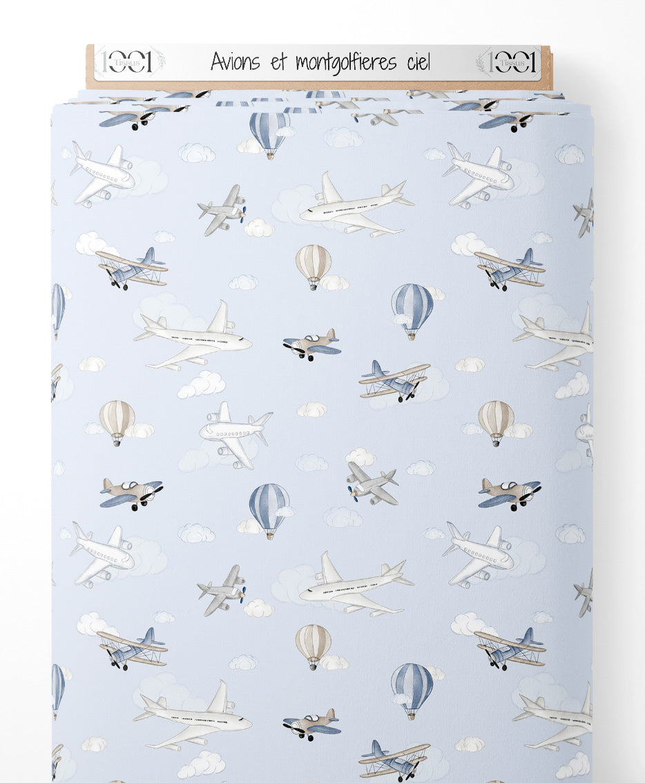 Les avions sont de différentes tailles et styles, certains modernes et d'autres vintage. Les montgolfières présentent des rayures bleues et beiges. Le ciel est parsemé de petits nuages blancs, ajoutant une touche aérienne au motif.Les tissus