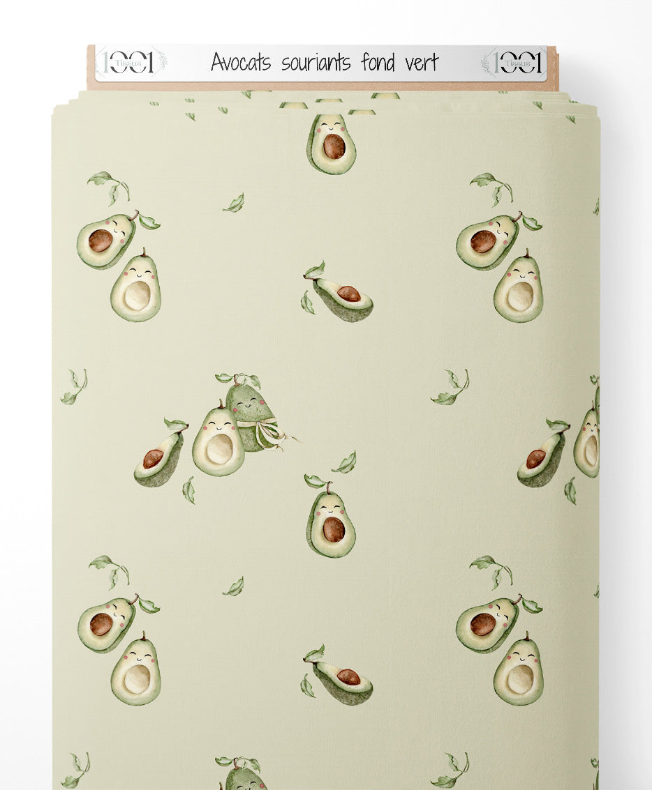 Les avocats sont illustrés avec des expressions souriantes. Quelques feuilles vertes accompagnent les avocats sur le fond.Les tissus