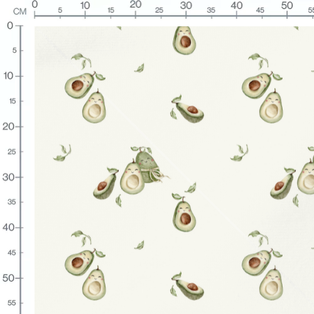 Les avocats sont dessinés avec des visages souriants et des noyaux visibles. Les feuilles vertes ajoutent une touche naturelle au motif. Chaque avocat est unique avec des expressions différentes.Les tissus