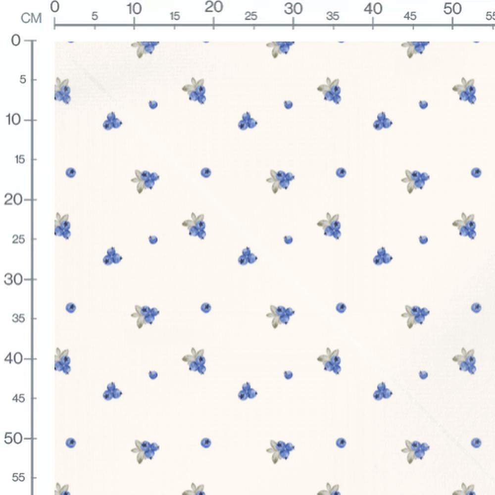 Les baies sont accompagnées de petites feuilles vertes. Le fond crème met en valeur les nuances de bleu des baies.Les tissus