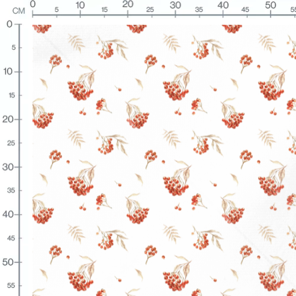 Les baies sont regroupées en grappes avec des nuances de rouge. Les feuilles sont délicatement dessinées avec des teintes brunes et beiges.Les tissus