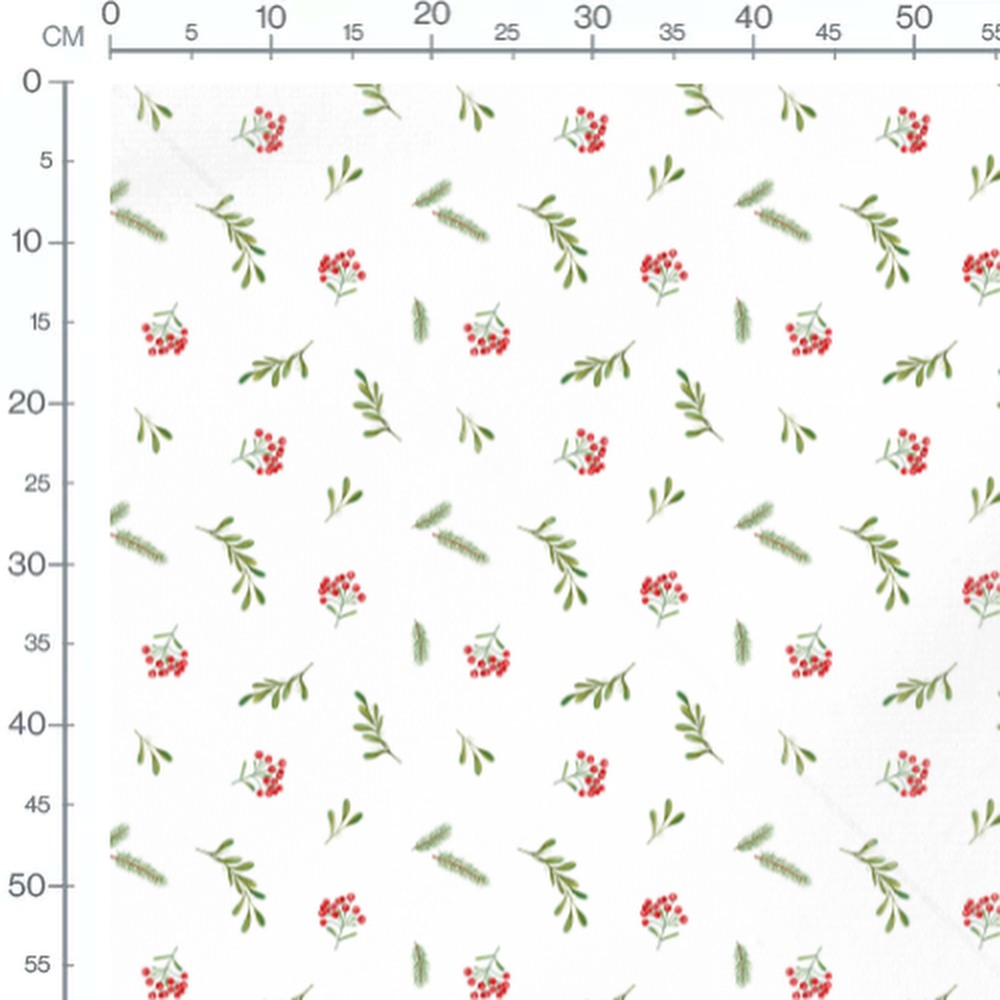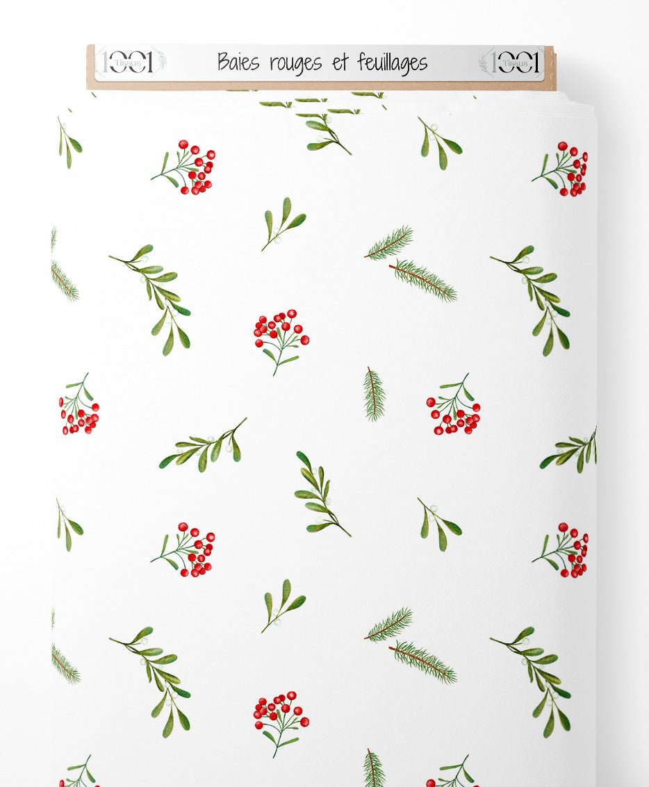 Les baies rouges sont accompagnées de petites feuilles vertes. Les branches de sapin ajoutent une touche hivernale au motif. Les feuilles de gui sont délicatement dessinées.Les tissus