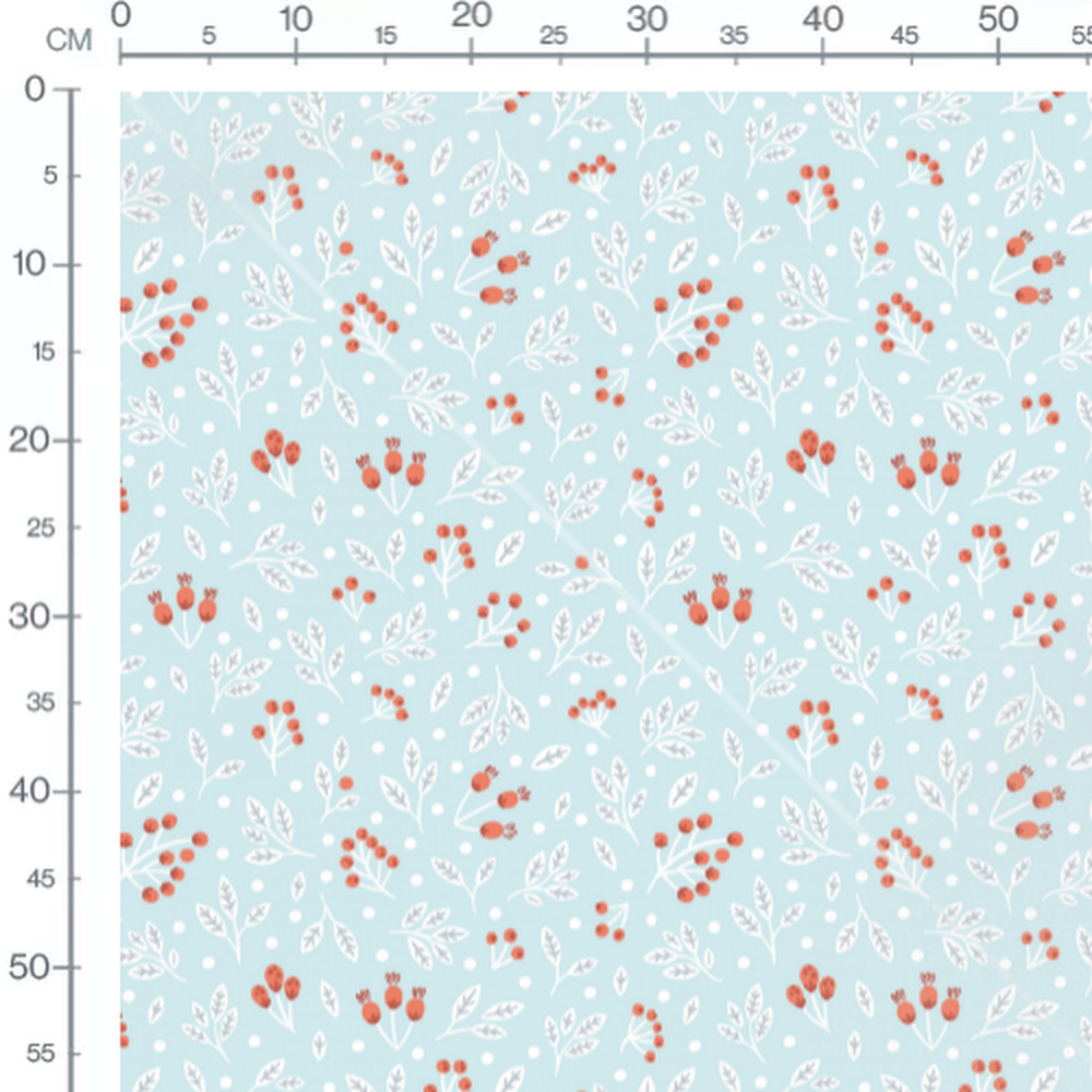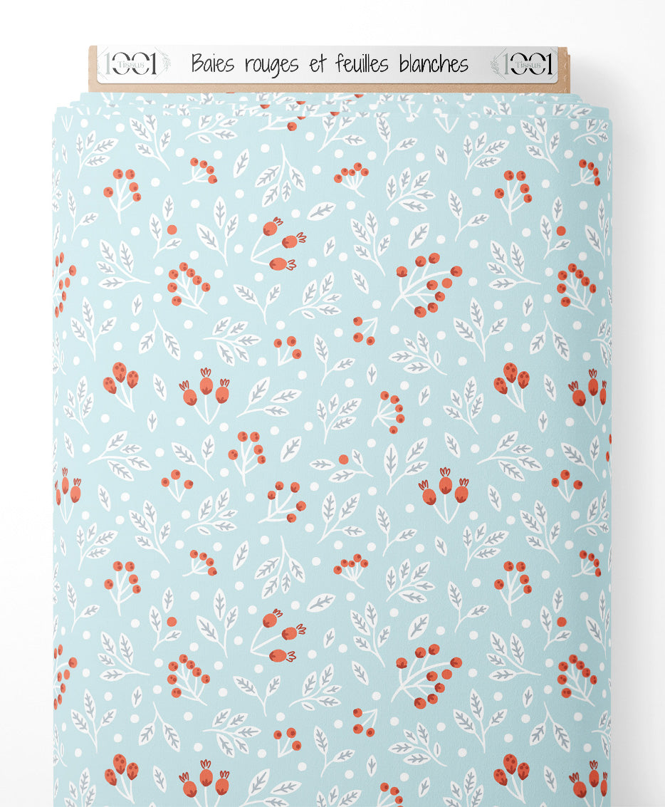 Les baies rouges sont entourées de feuilles blanches délicates. Le fond bleu clair met en valeur les motifs naturels.Les tissus