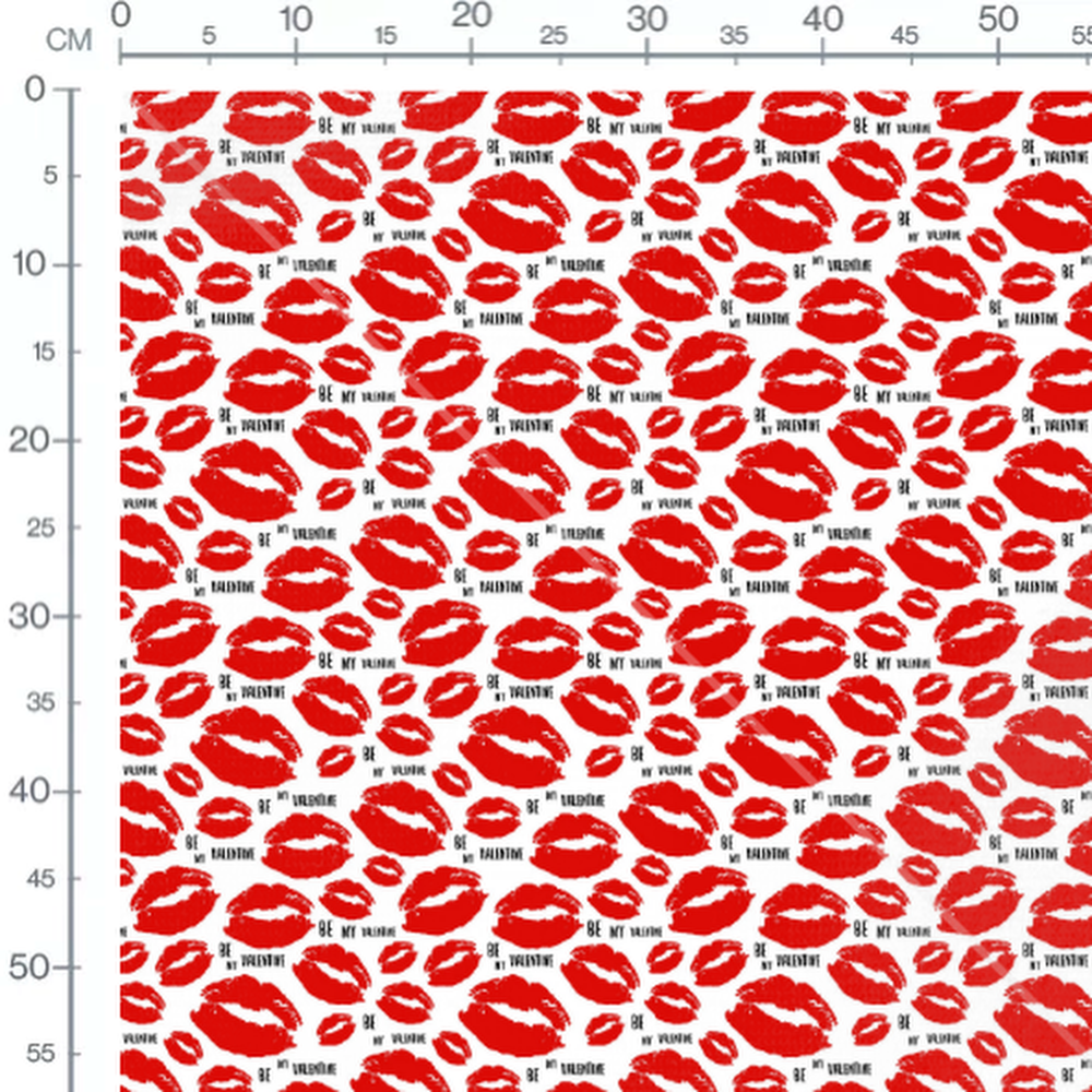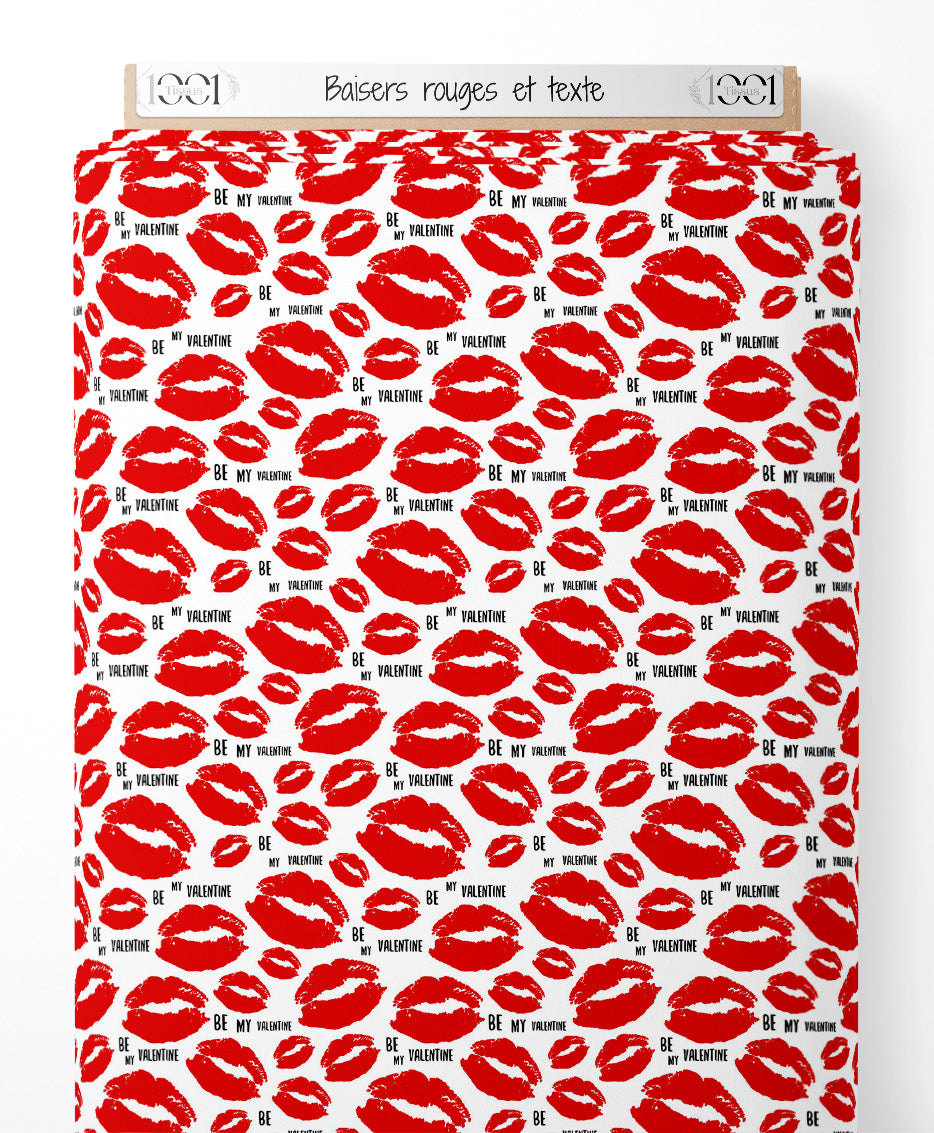Les lèvres sont de différentes tailles et nuances de rouge. Le texte est dispersé entre les motifs de baisers. Le fond blanc met en valeur les couleurs vives des motifs.Les tissus