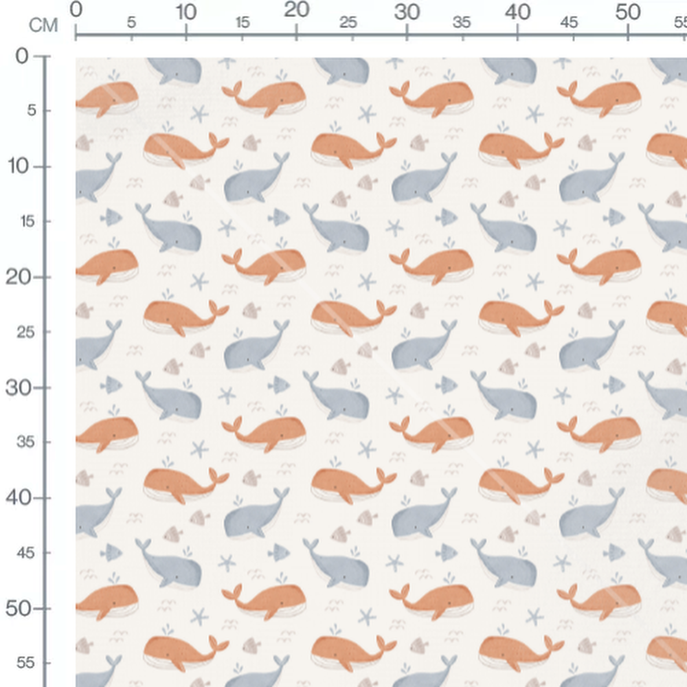 Les baleines sont accompagnées de petits poissons gris. Des étoiles de mer bleues et des vagues grises complètent le motif marin.Les tissus