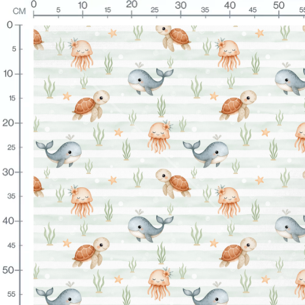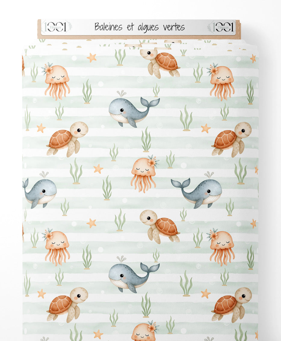 Les baleines sont grises avec des sourires doux. Les tortues ont des carapaces brunes et des pattes beiges. Les méduses sont orange avec des tentacules délicates. Les étoiles de mer sont orange clair et les algues sont d'un vert tendre.Les tissus