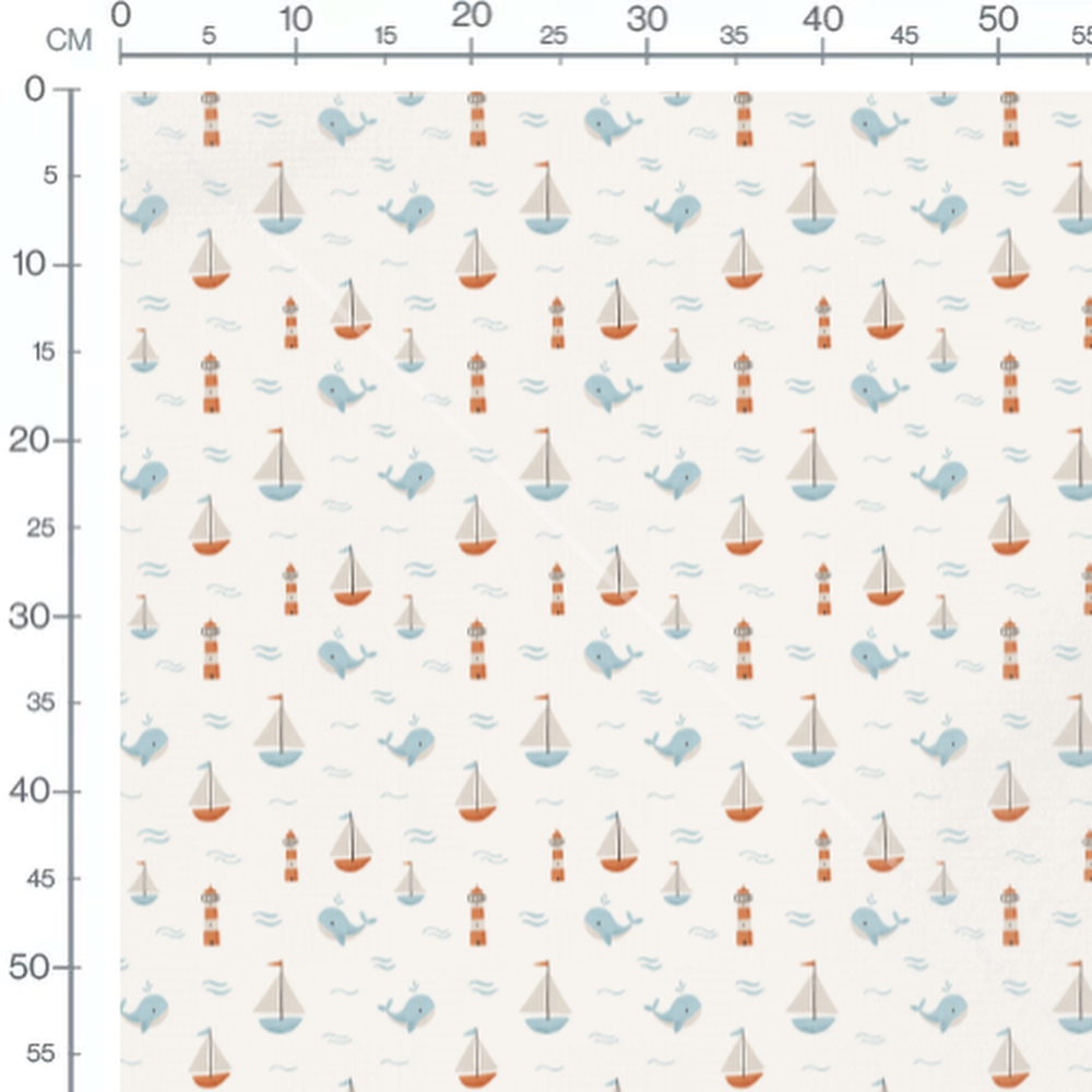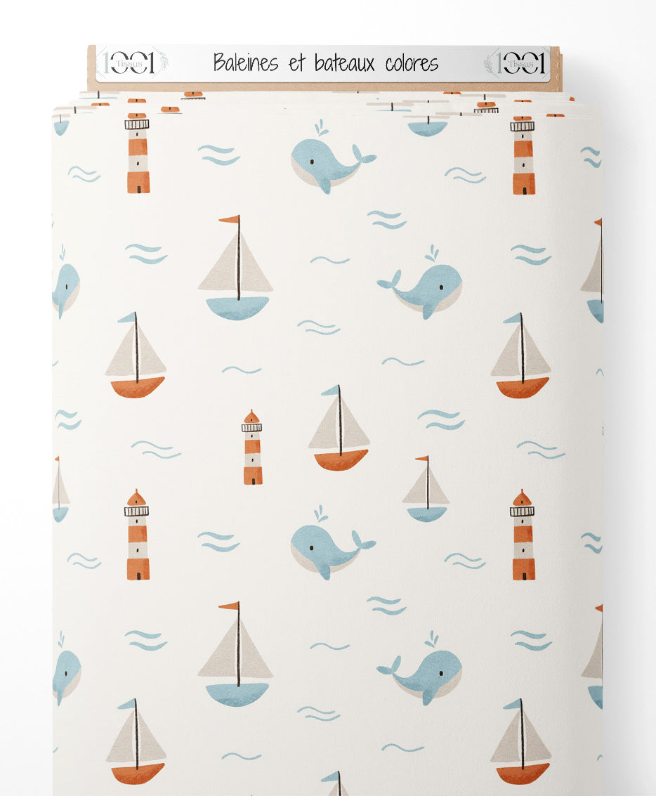 Les baleines sont accompagnées de phares rayés rouges et blancs. Les bateaux à voiles sont de couleur beige et bleue. De petites vagues bleues ajoutent un élément marin au motif.Les tissus