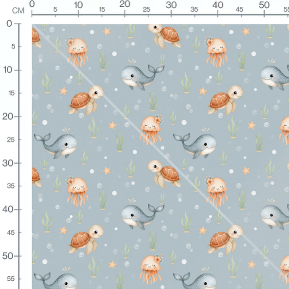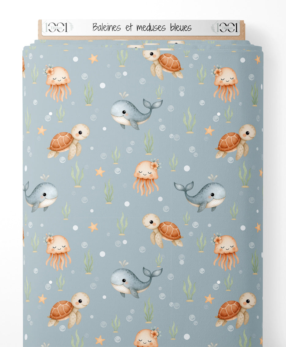 Les baleines sont grises avec un sourire. Les tortues ont une carapace brune et des nageoires beige. Les méduses sont orange avec des tentacules ondulées. Des bulles blanches flottent autour des animaux.Les tissus
