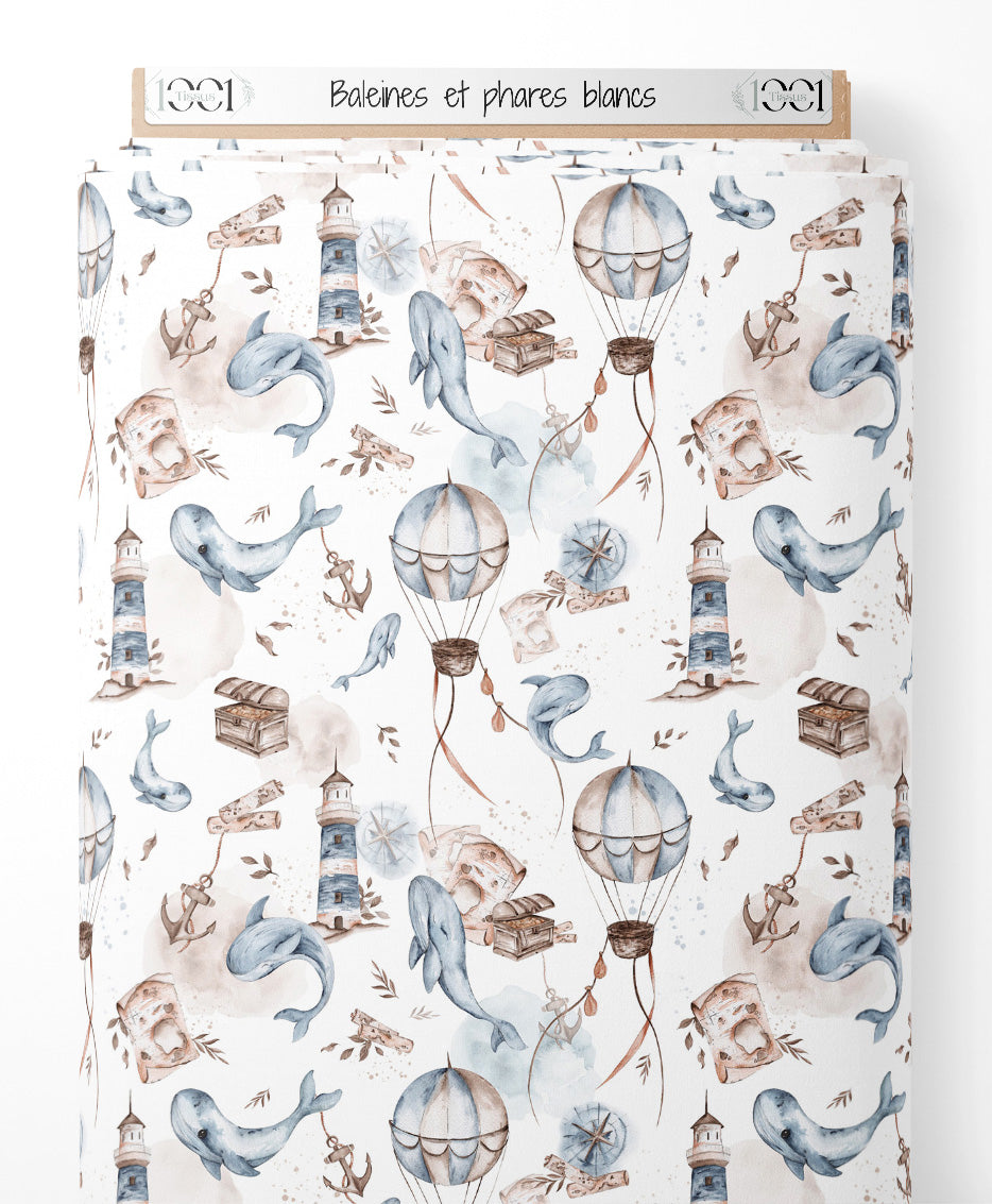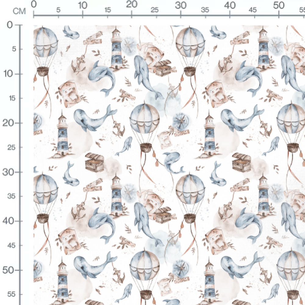 Ancres et cartes au trésor dispersées parmi les éléments maritimes. Feuilles et nuages ajoutent une touche de douceur. Les couleurs dominantes sont le bleu et le brun clair.Les tissus