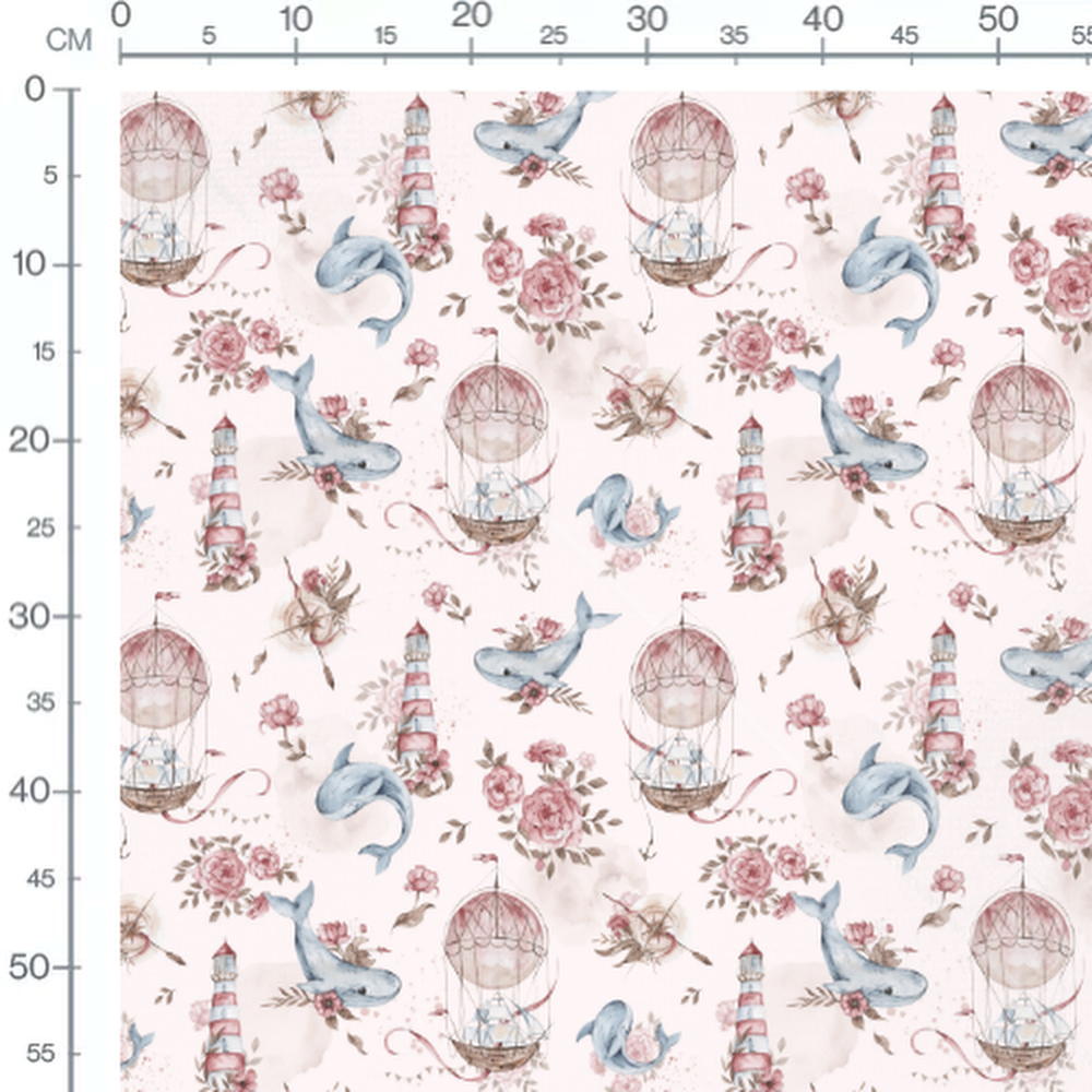 Les baleines sont entourées de roses et de phares marins. Les montgolfières ajoutent une touche aérienne au design. Les couleurs douces de l'aquarelle créent une ambiance rêveuse.Les tissus