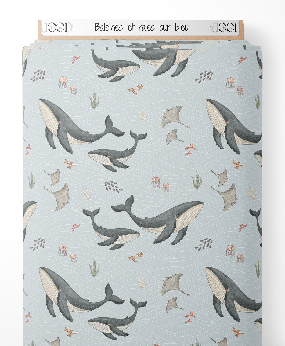 Les baleines sont accompagnées de raies grises nageant paisiblement. Des coraux roses et des méduses ajoutent des touches de couleur. Des algues vertes complètent le motif marin.Les tissus