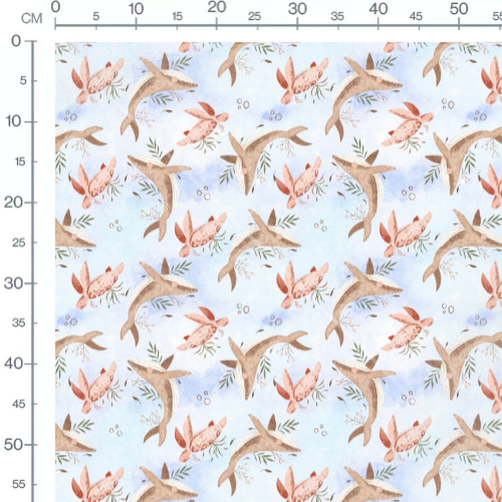 Les baleines sont accompagnées de petites branches et de motifs floraux. Les tortues présentent des motifs géométriques sur leur carapace. Le fond bleu clair donne une impression aquatique douce.Les tissus