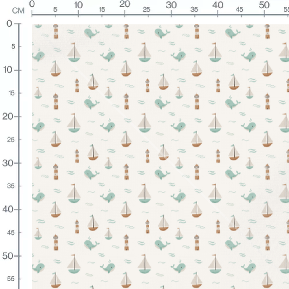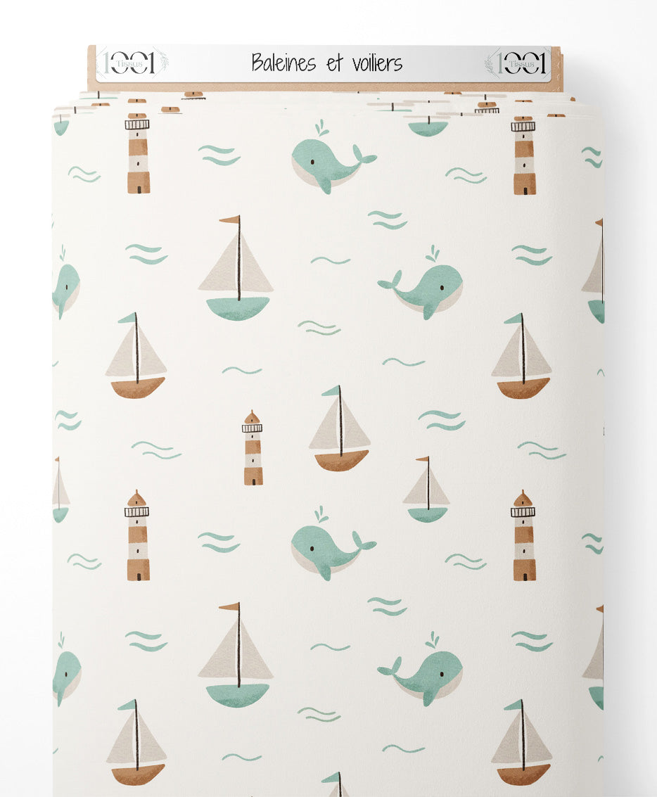 Les baleines sont accompagnées de petits voiliers aux voiles blanches. Des phares marron et blanc ajoutent une touche côtière. Les vagues sont représentées par des lignes courbes bleues.Les tissus