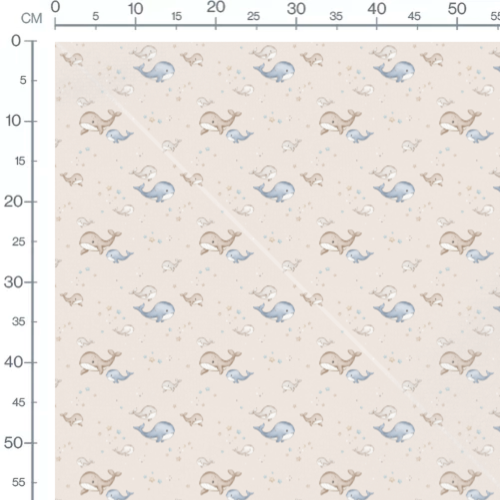 Les baleines sont dessinées dans des tons doux de gris et de bleu. De petites étoiles beige et bleues parsèment le fond. Des points blancs ajoutent une touche de légèreté au motif.Les tissus