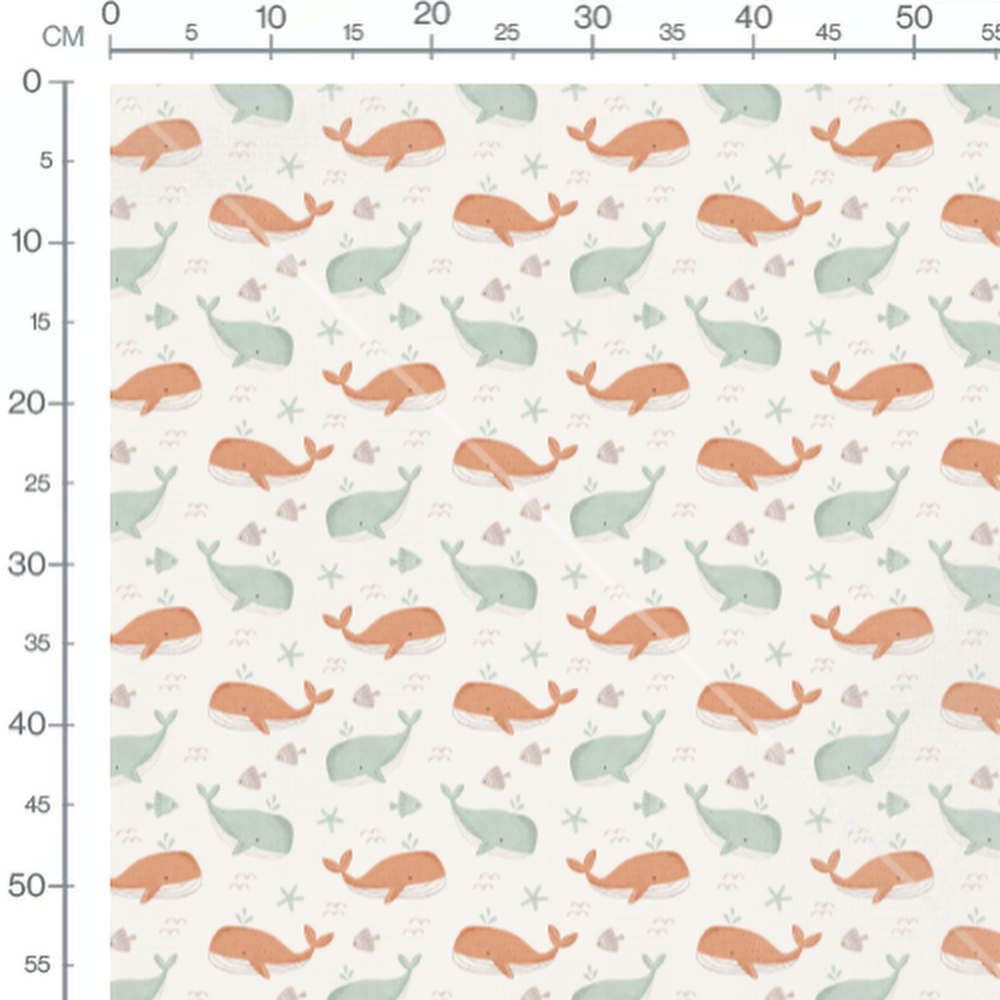 Les baleines sont accompagnées de petits poissons gris. Des motifs marins verts ajoutent une touche ludique.Les tissus