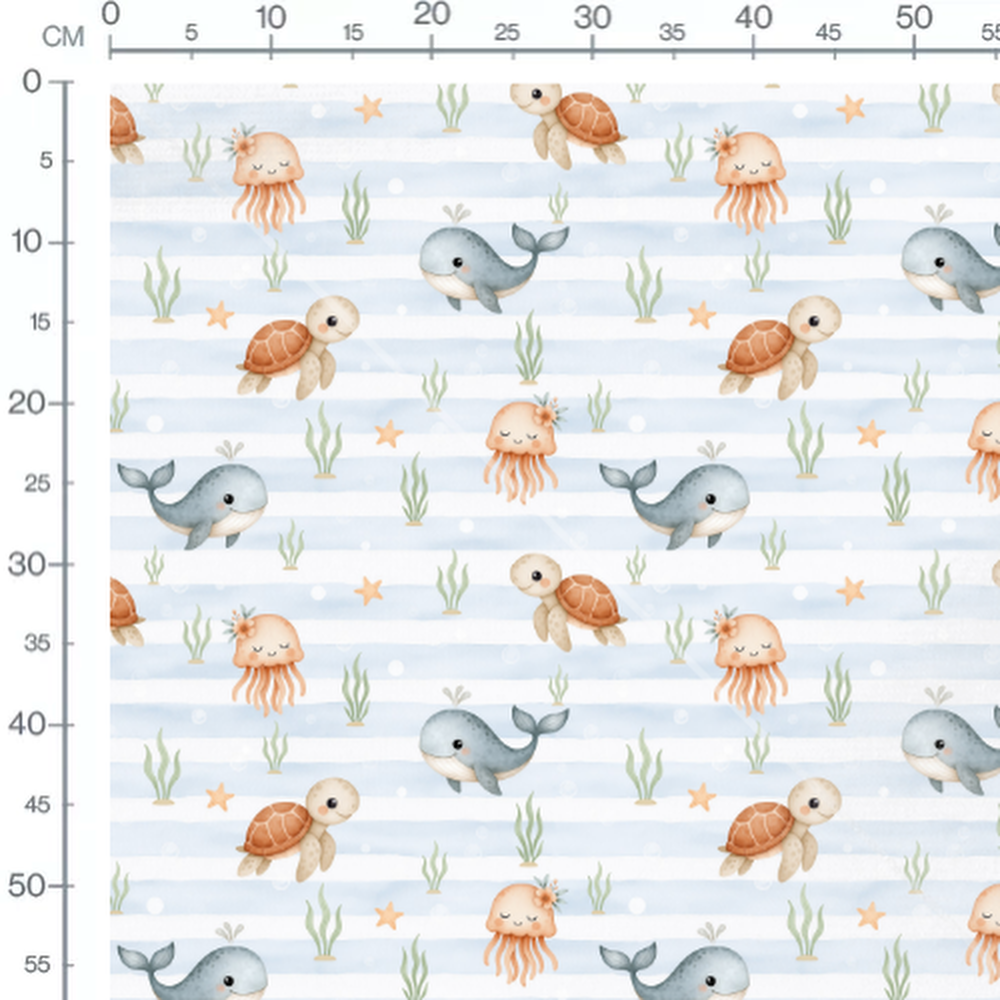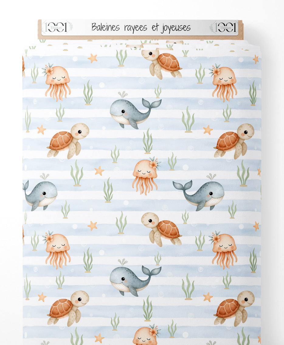 Les baleines sont grises avec des sourires doux. Les tortues ont des carapaces brunes et des expressions amicales. Les méduses sont orange avec des fleurs sur la tête. Des étoiles de mer orange et des algues vertes ajoutent des détails marins.Les tissus