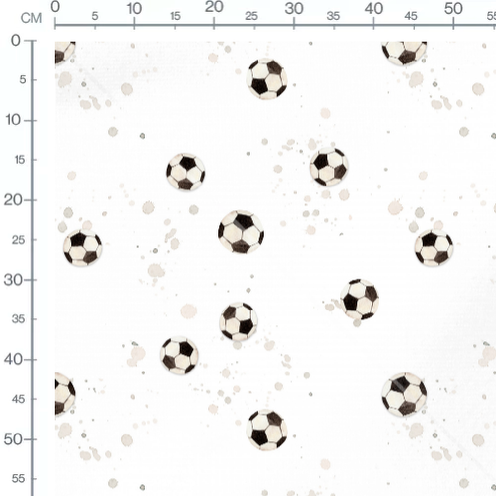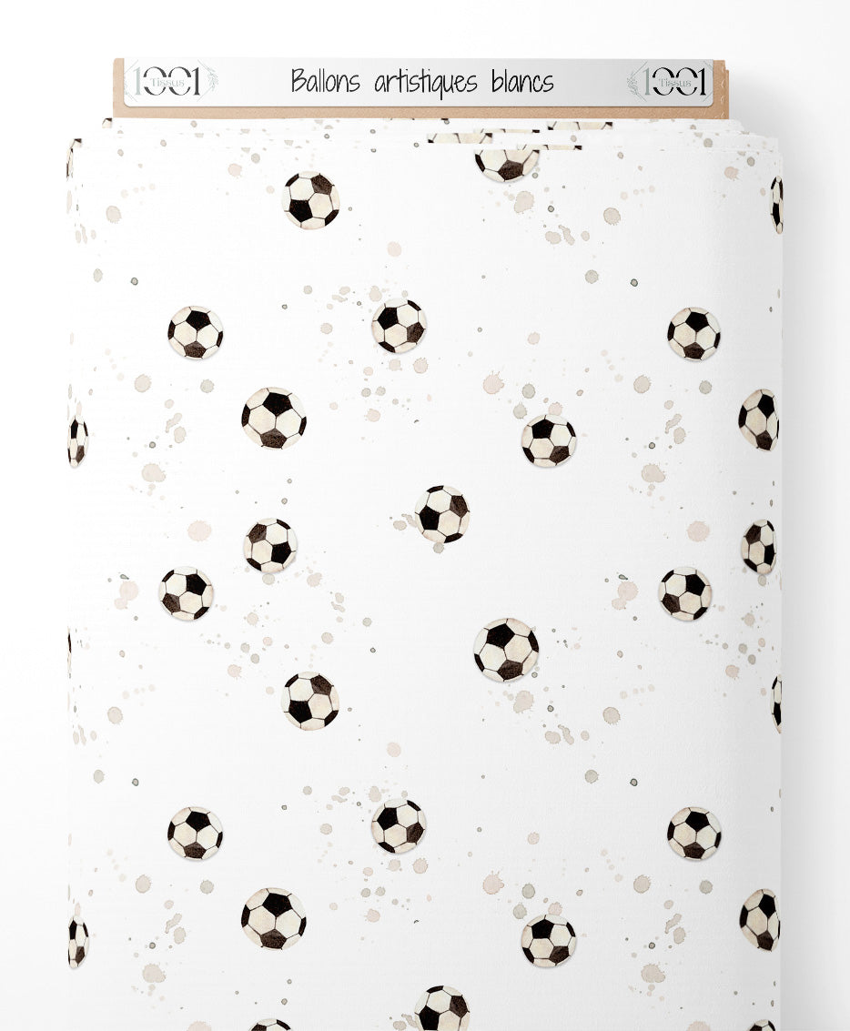 Les ballons de football sont répartis de manière aléatoire. Les taches ajoutent une touche artistique au fond blanc.Les tissus