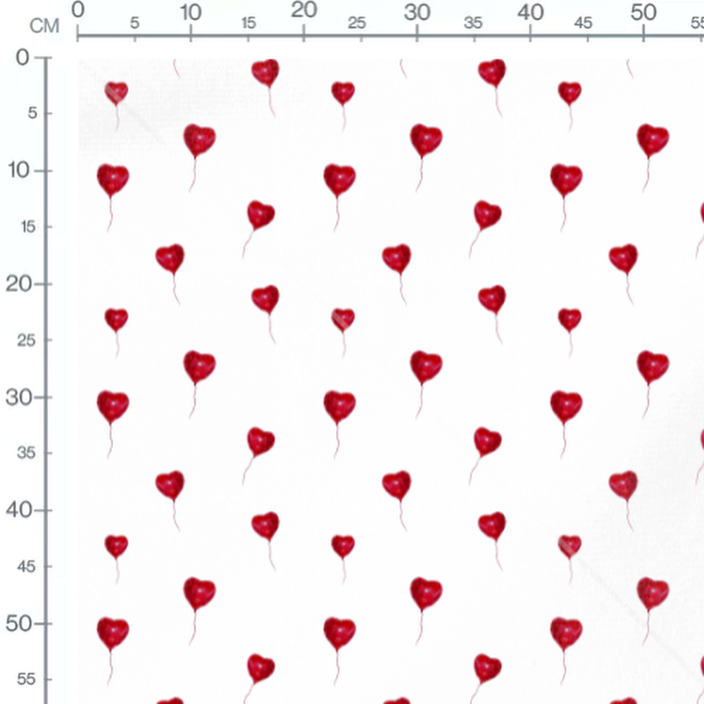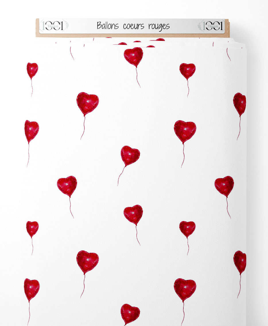 Les ballons sont de couleur rouge vif et ont une forme de cœur distincte. Chaque ballon est attaché à un fil fin et délicat. Le fond blanc met en valeur la couleur éclatante des ballons.Les tissus