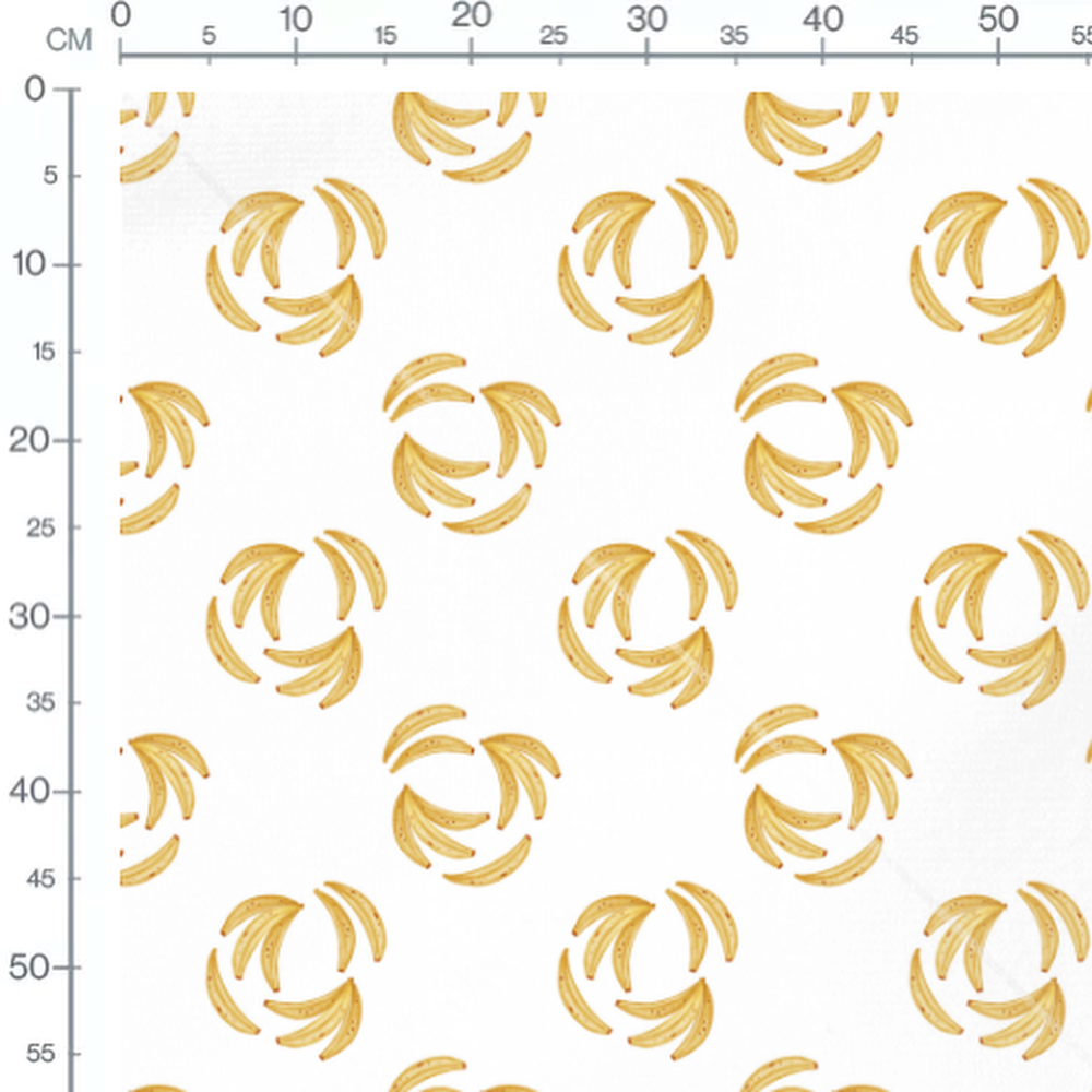 Les bananes sont dessinées dans un style aquarelle avec des nuances de jaune et des taches brunes. Le fond blanc met en valeur les détails des fruits. Chaque banane est représentée avec une courbure naturelle.Les tissus