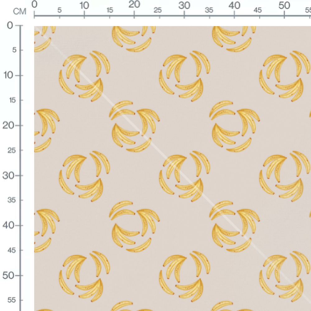 Les bananes sont disposées en groupes sur un fond beige. Chaque banane est détaillée avec des nuances de jaune et des taches brunes.Les tissus