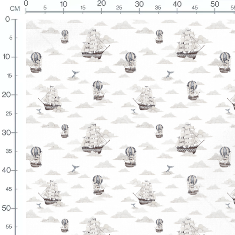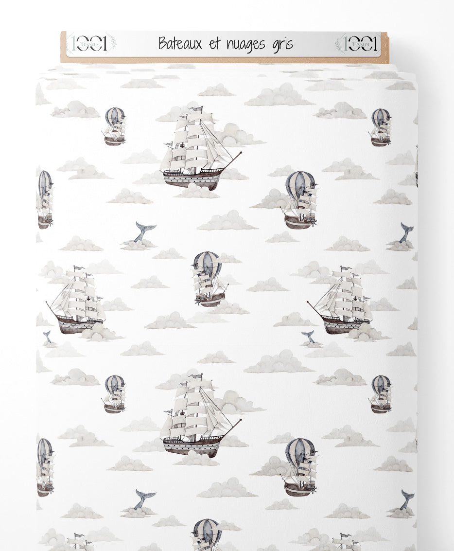 Une queue de baleine grise émerge parmi les nuages. Les montgolfières sont détaillées avec des motifs de voiles. Les nuages sont de différentes tailles et formes.Les tissus