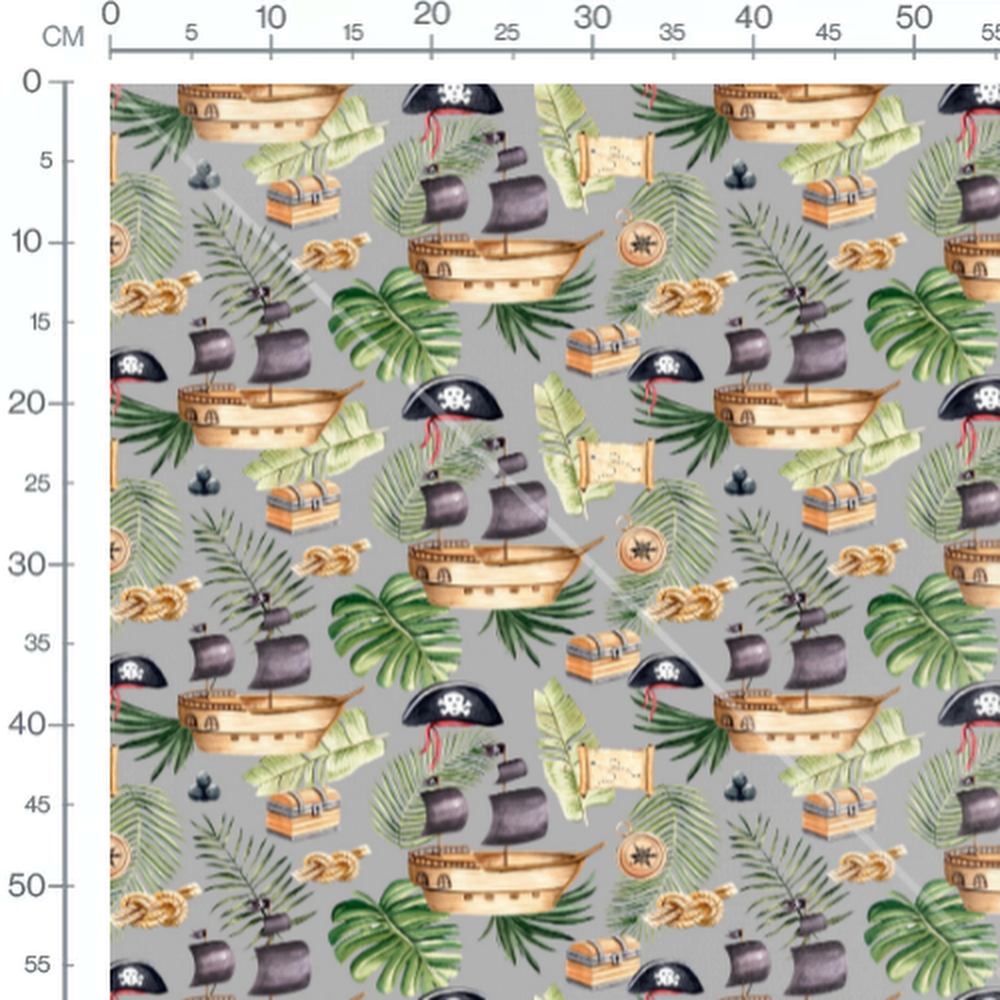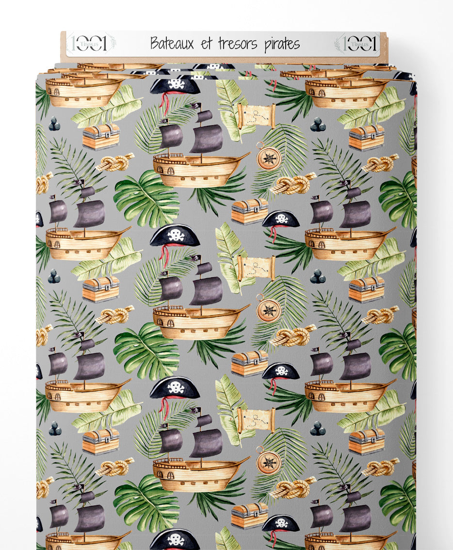 Cordes nouées et cartes au trésor ajoutent au thème. Petits boulets de canon noirs complètent le motif.Les tissus