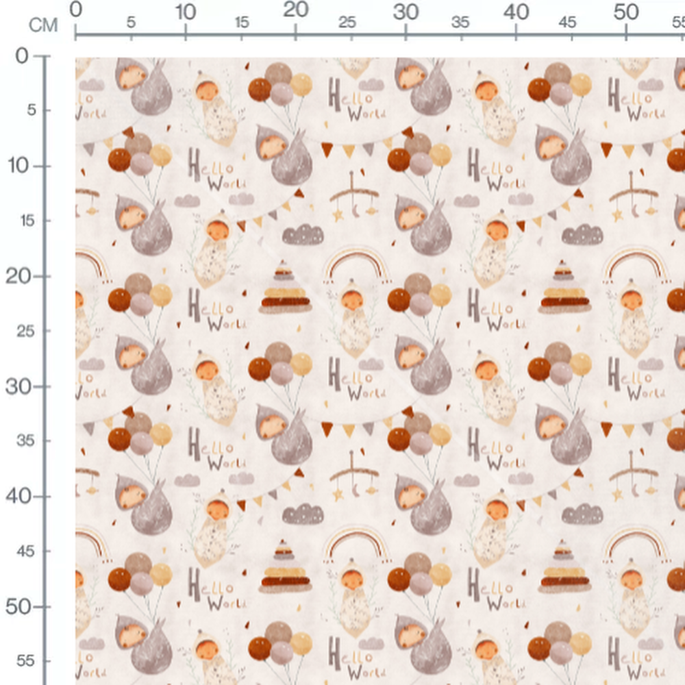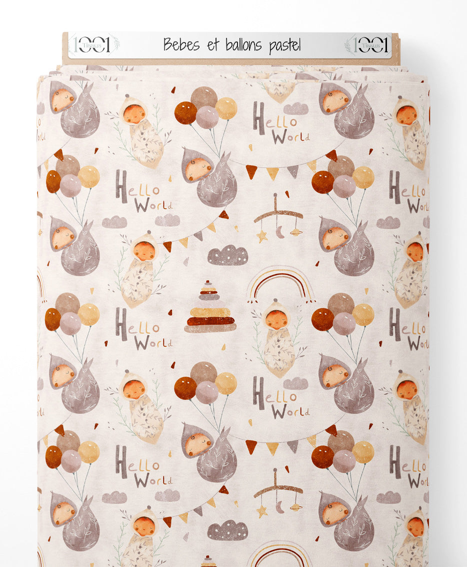 Les bébés sont entourés de ballons dans des tons de brun et beige. Des nuages et des arcs-en-ciel ajoutent une touche douce et rêveuse. Le texte 'Hello World' est dispersé parmi les éléments. Des guirlandes et des étoiles apportent une ambiance festive.Les tissus