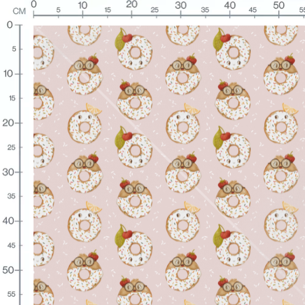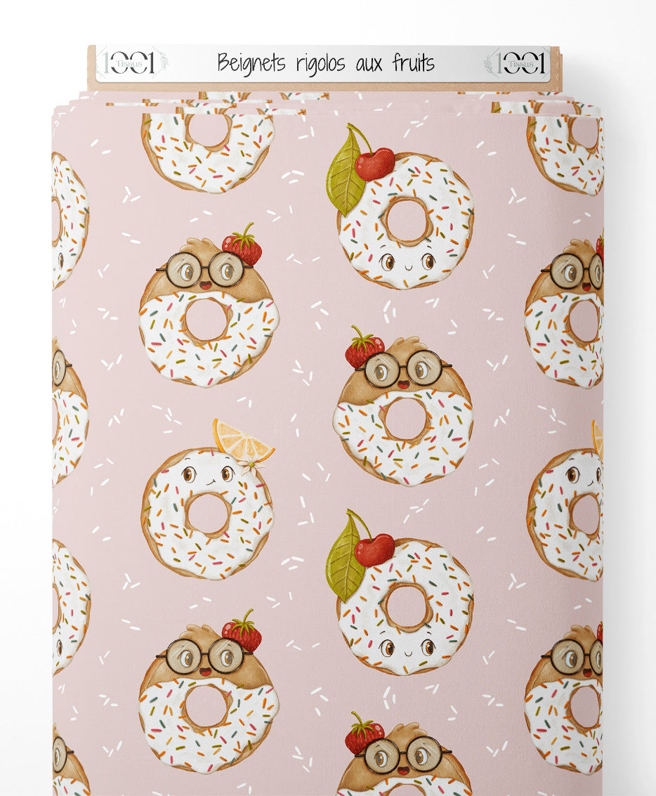 Certains beignets portent des lunettes et sont ornés de fraises ou de tranches de citron. Le fond rose est parsemé de petits traits blancs.Les tissus