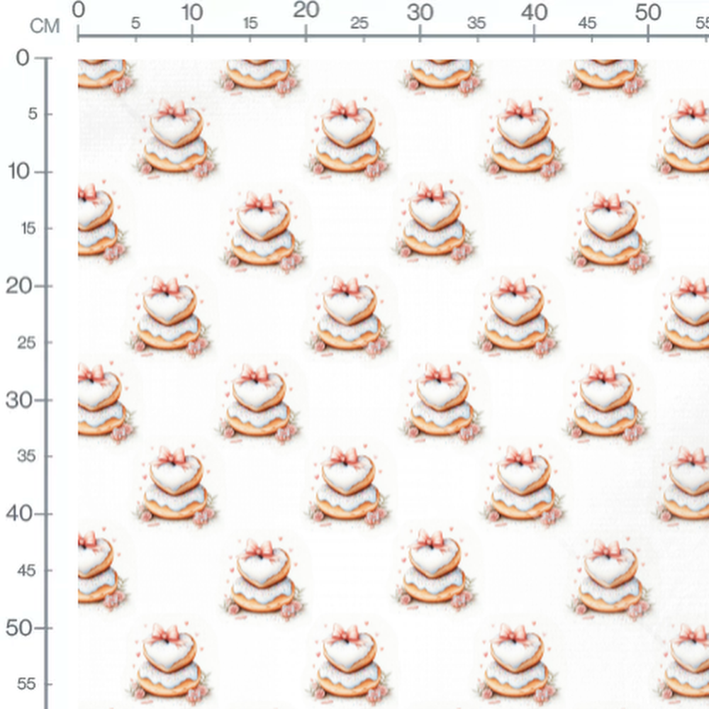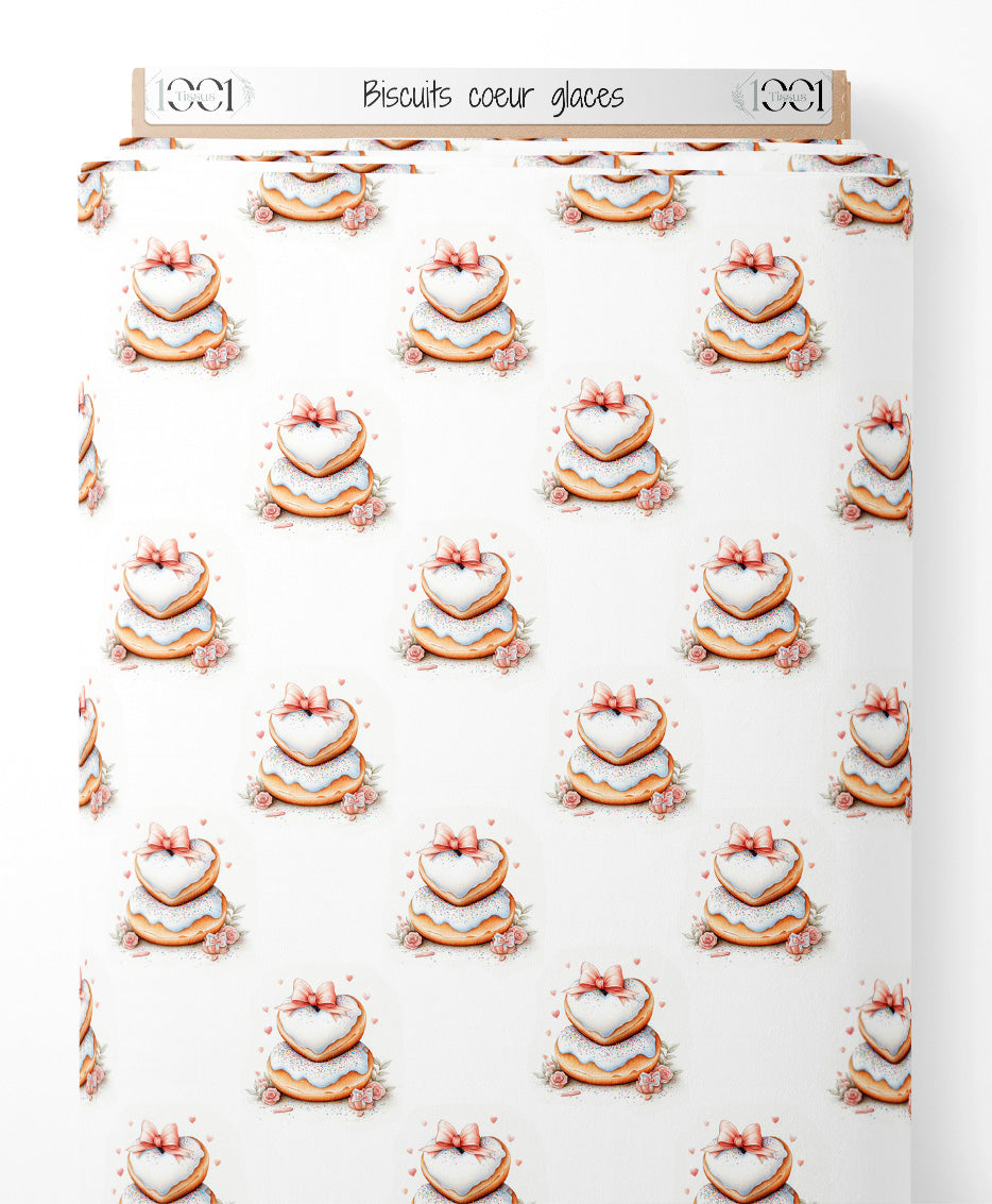 Les biscuits sont décorés de glaçage blanc et ornés d'un nœud rose. De délicates fleurs roses et des feuilles vertes complètent le motif gourmand.Les tissus