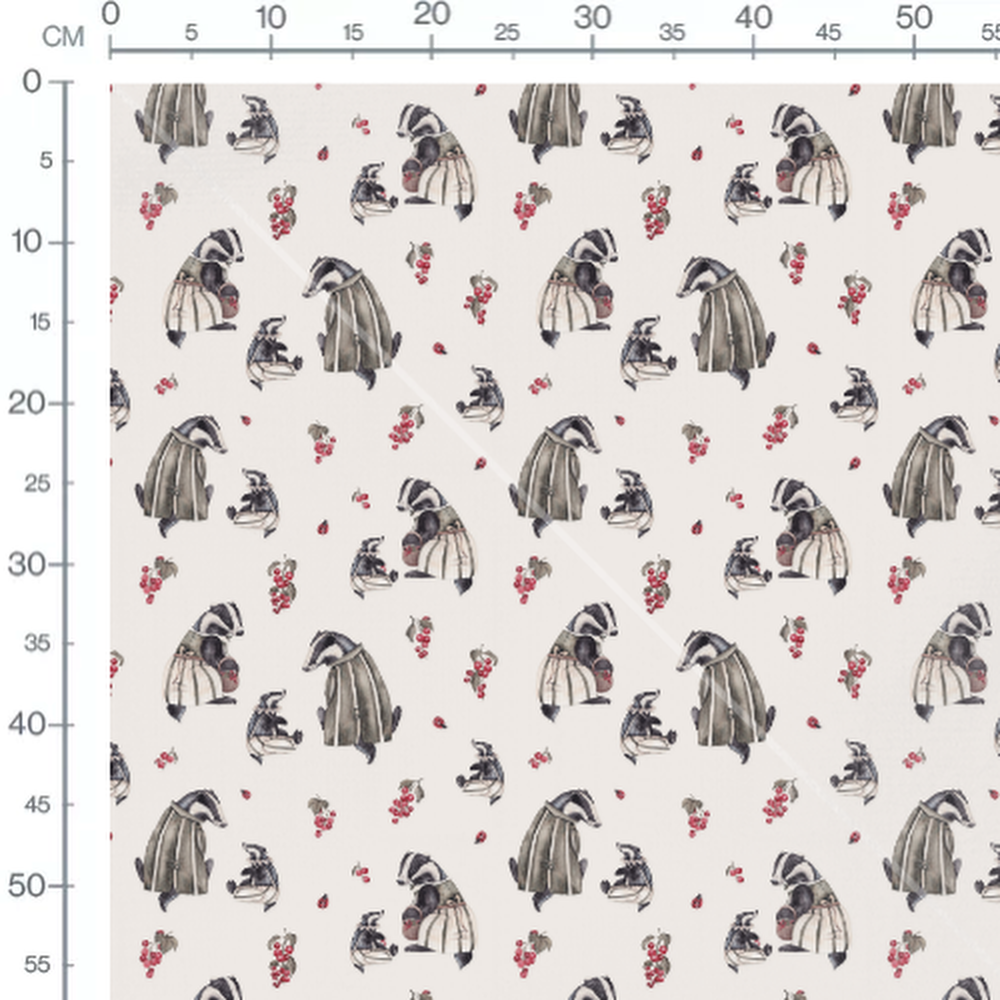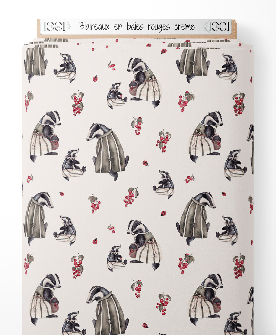 Les blaireaux sont dessinés avec des détails réalistes et portent des vêtements. Les grappes de baies rouges ajoutent une touche de couleur vive. Le fond crème met en valeur les illustrations des animaux et des baies.Les tissus