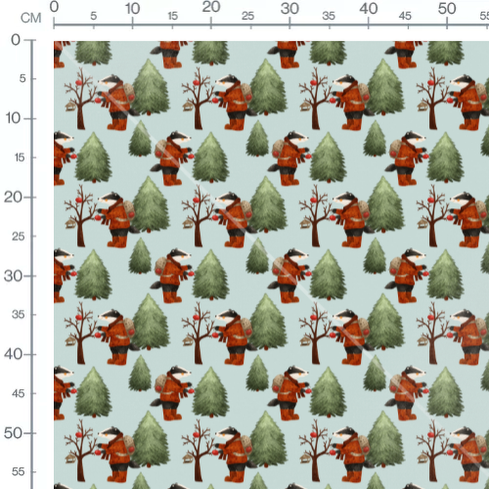 Les blaireaux portent des vêtements d'hiver et ramassent des pommes rouges. Les sapins verts ajoutent une touche de nature. Des arbres nus et une petite cabane sont également présents.Les tissus
