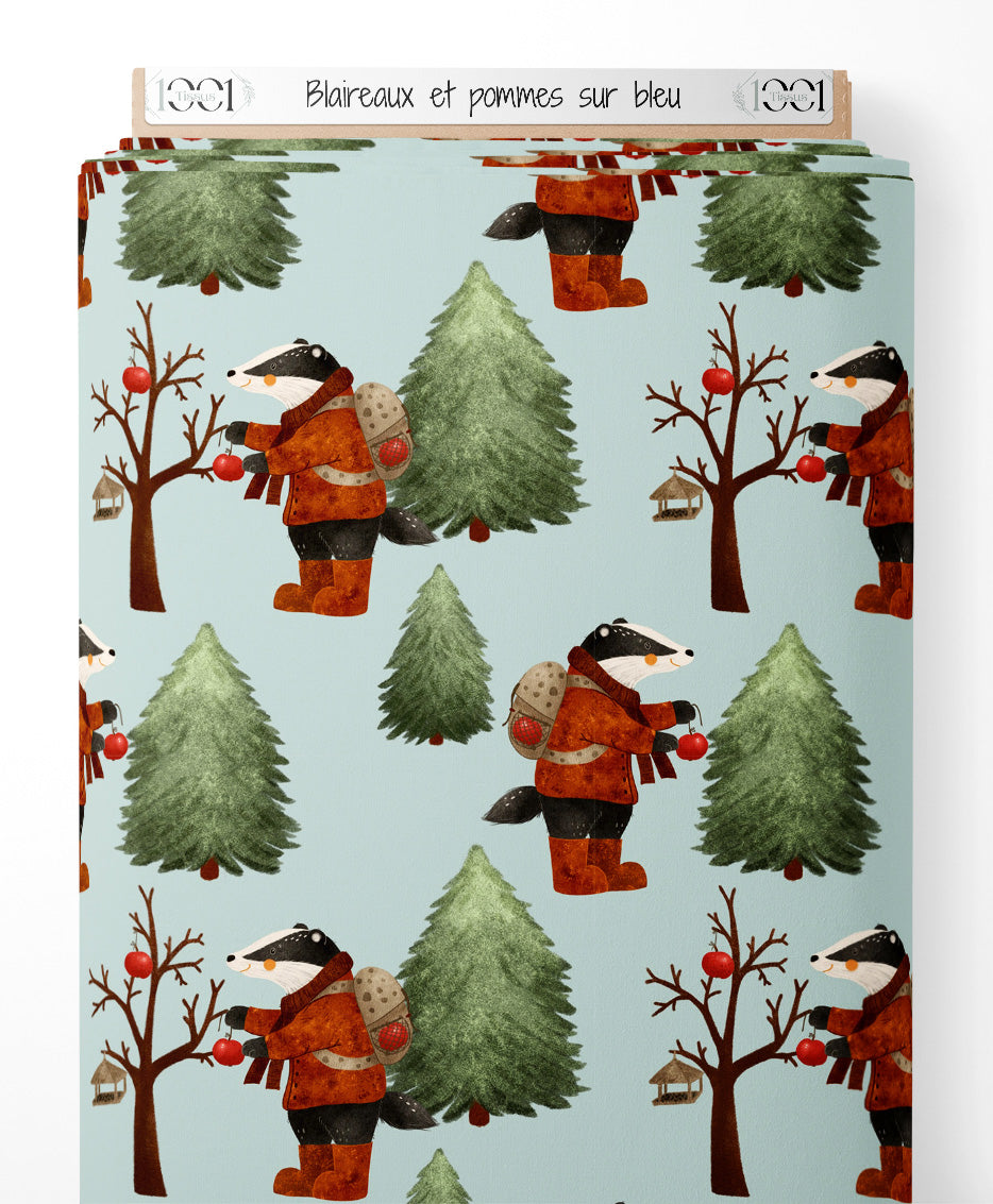 Tissu - Blaireaux et pommes sur bleu