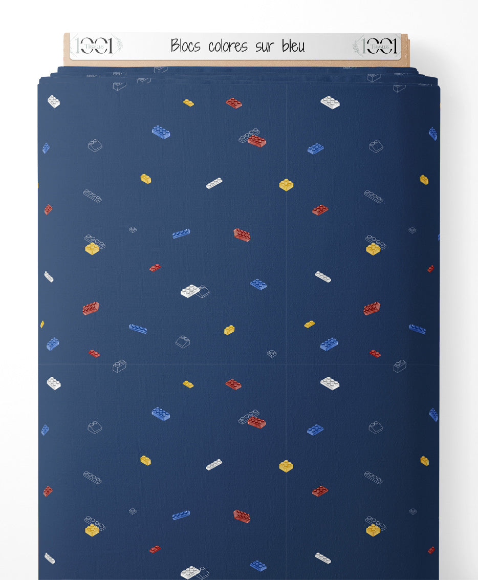 Les blocs rouges, jaunes, bleus et blancs sont dispersés sur le fond. Les contours blancs ajoutent un effet de dessin technique au motif.Les tissus