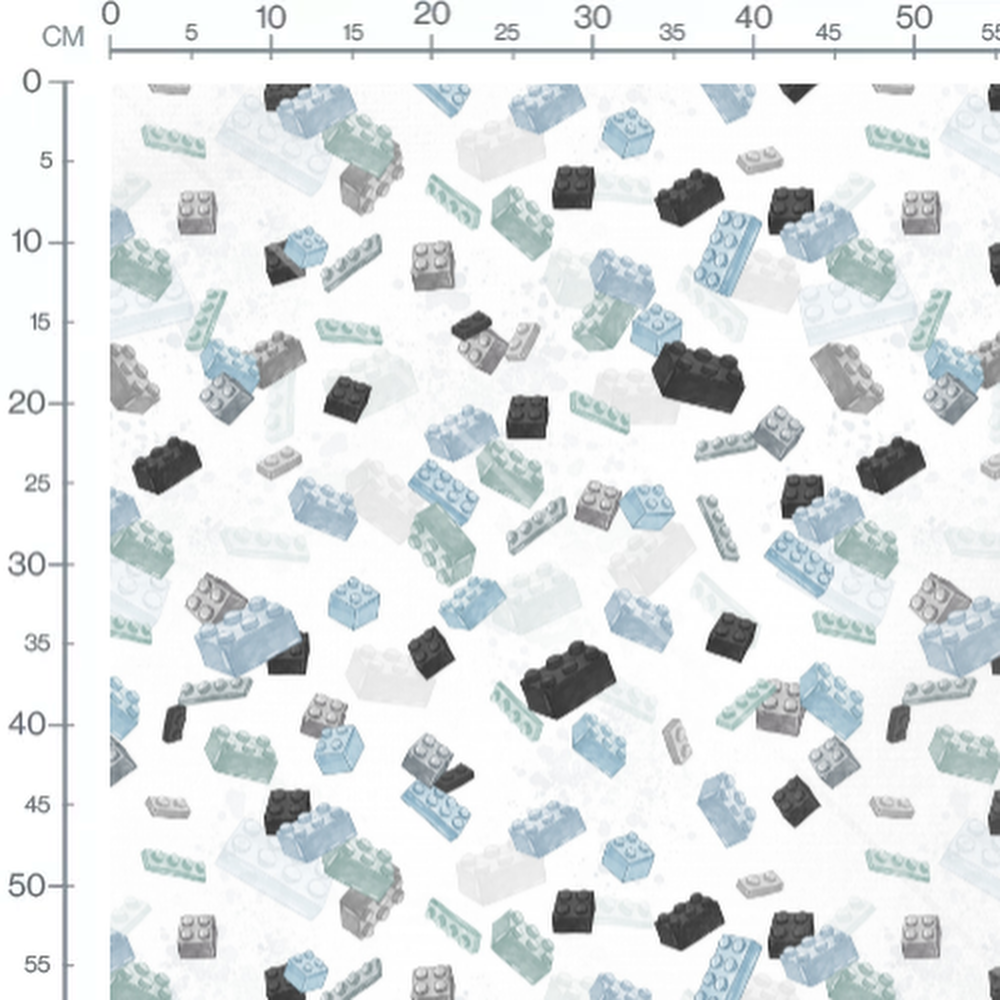 Les blocs sont principalement rectangulaires et carrés. Les couleurs varient entre le noir, le bleu clair et le gris. Les blocs sont disposés de manière aléatoire, créant un motif dynamique. Les nuances de bleu ajoutent une touche de fraîcheur au design.Les tissus