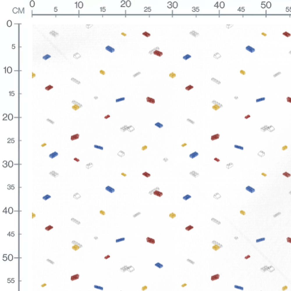 Les blocs rouges, bleus et jaunes sont répartis de manière aléatoire. Chaque bloc a une forme et une taille unique, ajoutant de la variété au motif.Les tissus